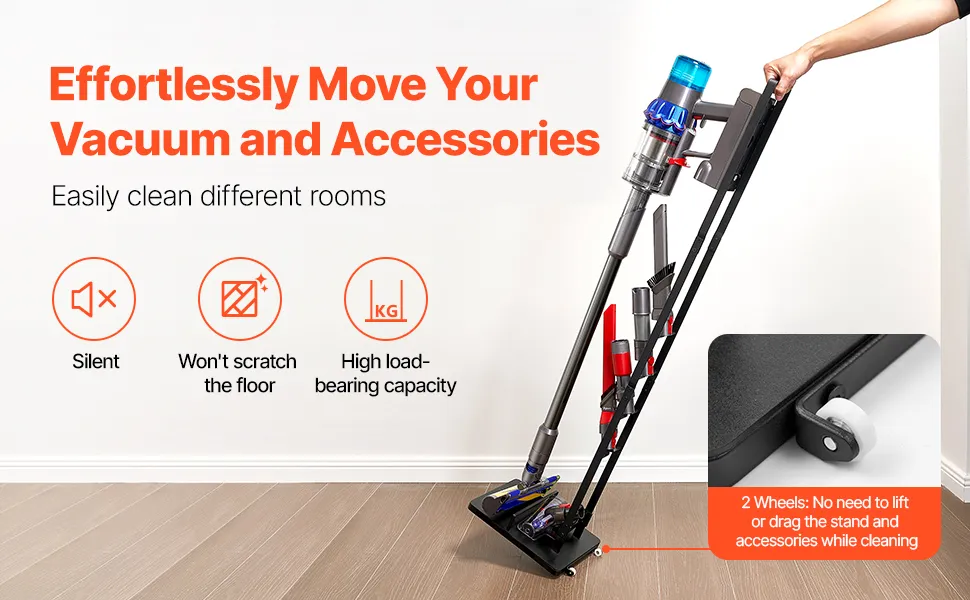 Deze 50-inch stofzuigerstandaard voor Dyson heeft 4 haken en is compatibel met meerdere modellen. De stevige basis, het koudgewalste stalen frame en de antislipkussentjes zorgen voor stabiliteit, terwijl de stille wielen zorgen voor eenvoudige verplaatsing. Compact, geen boren nodig en eenvoudig te installeren: de ideale opbergoplossing.