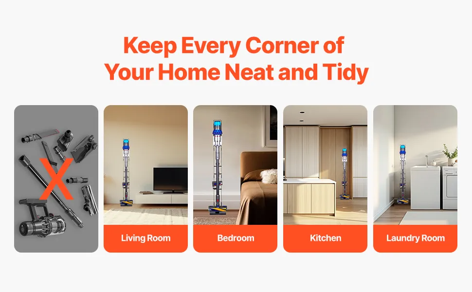 Of het nu in de woonkamer, slaapkamer, keuken of wasruimte is, deze standaard helpt u bij het organiseren van uw stofzuiger en accessoires, maakt vloeroppervlak vrij en zorgt voor een opgeruimde leefruimte voor een opgeruimd huis.
