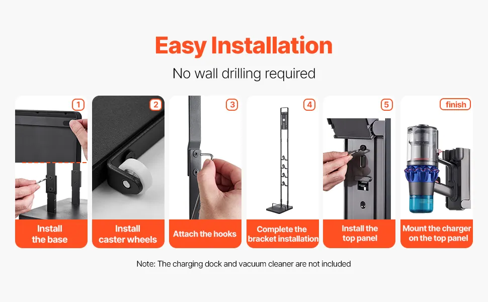 Dankzij het vrijstaande ontwerp is wandmontage niet nodig en kunt u uw stofzuiger veilig opbergen. Met de eenvoudige stappen voor het monteren van de basis, haken en afdekplaat, kunt u het snel en zonder ingewikkelde installatie opzetten.