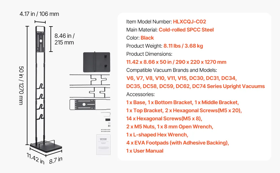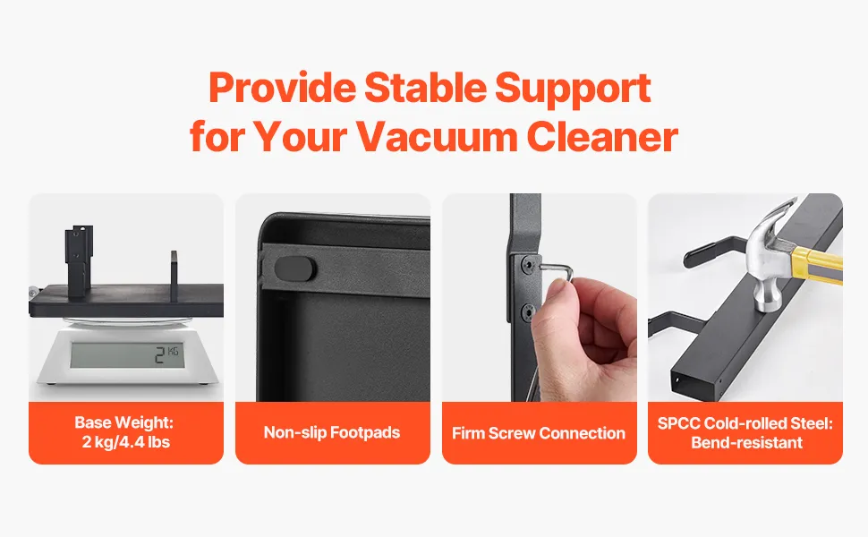 Onze stofzuigerstandaard is voorzien van een 2 kg zware, stevige basis met antislipnoppen en schroefverbindingen voor stabiliteit. Het is gemaakt van duurzaam koudgewalst SPCC-staal, is bestand tegen buigen en vervorming en biedt langdurige ondersteuning voor uw stofzuiger.