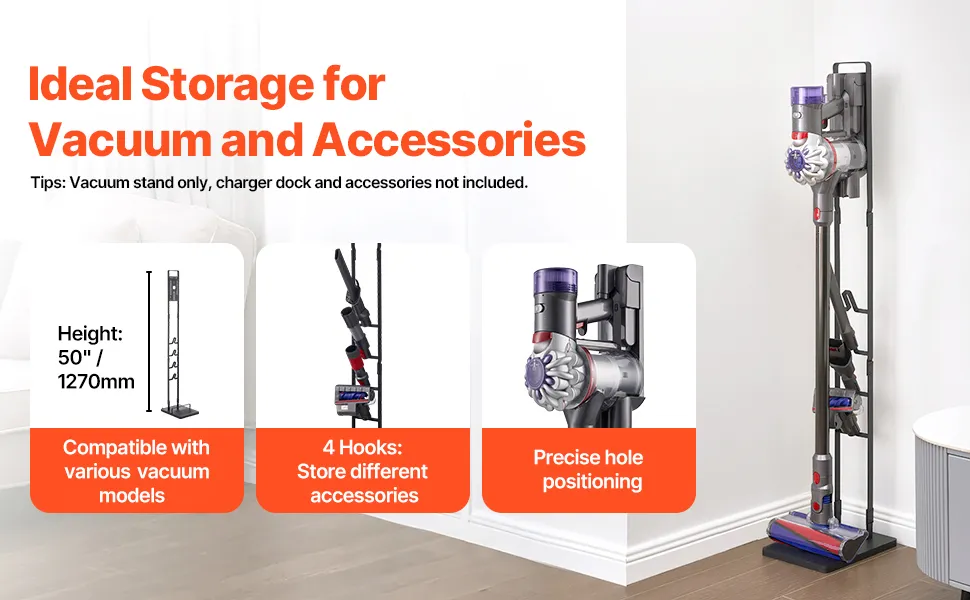 Efficiënte opslag: Deze stofzuigerstandaard is 50 inch/1270 mm hoog en heeft 4 haken om uw stofzuiger en accessoires netjes op te bergen en verlies te voorkomen. Het bespaart ruimte, voorkomt dat de stofzuiger per ongeluk valt en beschadigd raakt, verlengt de levensduur van de stofzuiger en zorgt er tegelijkertijd voor dat uw huis opgeruimd blijft.