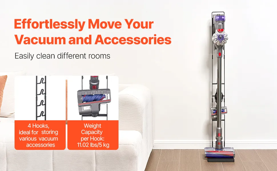 Robuust en duurzaam: deze stofzuigerhouder is gemaakt van hoogwaardig koudgewalst SPCC-staal en de 2 kg zware voet zorgt voor stabiliteit. Elke haak kan tot 5 kg dragen en houdt de stofzuiger en accessoires gemakkelijk vast. De antislipnoppen op de voet zorgen ervoor dat de standaard stevig op zijn plaats blijft staan en voorkomen dat deze omvalt of wegglijdt.