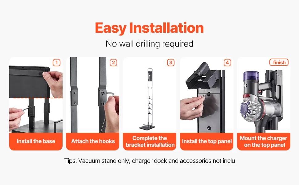 Dankzij het vrijstaande ontwerp is wandmontage niet nodig en kunt u uw stofzuiger veilig opbergen. Met de eenvoudige stappen voor het monteren van de basis, haken en afdekplaat, kunt u het snel en zonder ingewikkelde installatie opzetten.