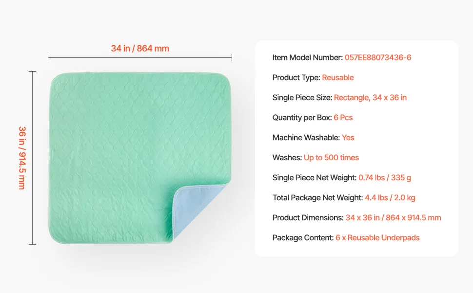 VEVOR Incontinentiepads, 864 x 914,5 mm herbruikbare bedpads, superabsorberend en snel drogend, voor huisdieren, volwassenen, kinderen en ouderen (6 stuks)