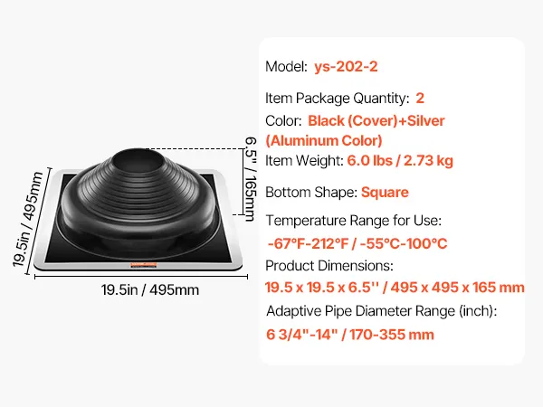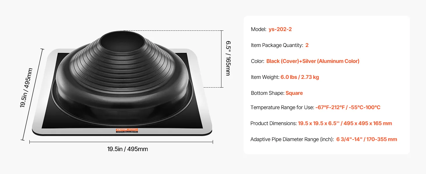 Flexible Design, Handles Various Sized-pipes: This roof pipe flashing kit includes 2 black EPDM square-based boots, each measuring 19.5'' x 19.5'' x 6.5''. Suitable for pipe diameters ranging from 6-3/4" to 14", they can be effortlessly cut to the size you need!