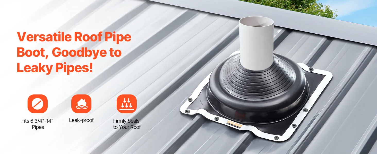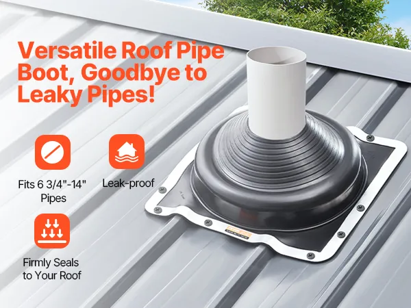 The roof pipe flashing boot fits pipe OD 6-3/4" to 14". With corrosion-proof EPDM cover, it beats high-temp & low-freeze. Flexible aluminum base allows easy cutting & installation, handing various roof materials and slopes. Durable & tightly sealing, it's your ideal choice for roof pipe leaks.