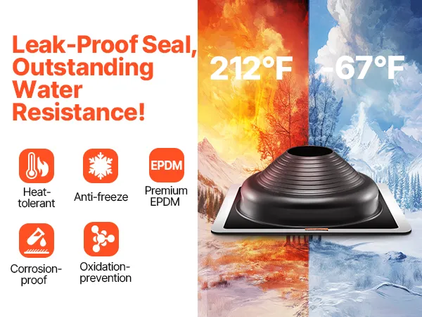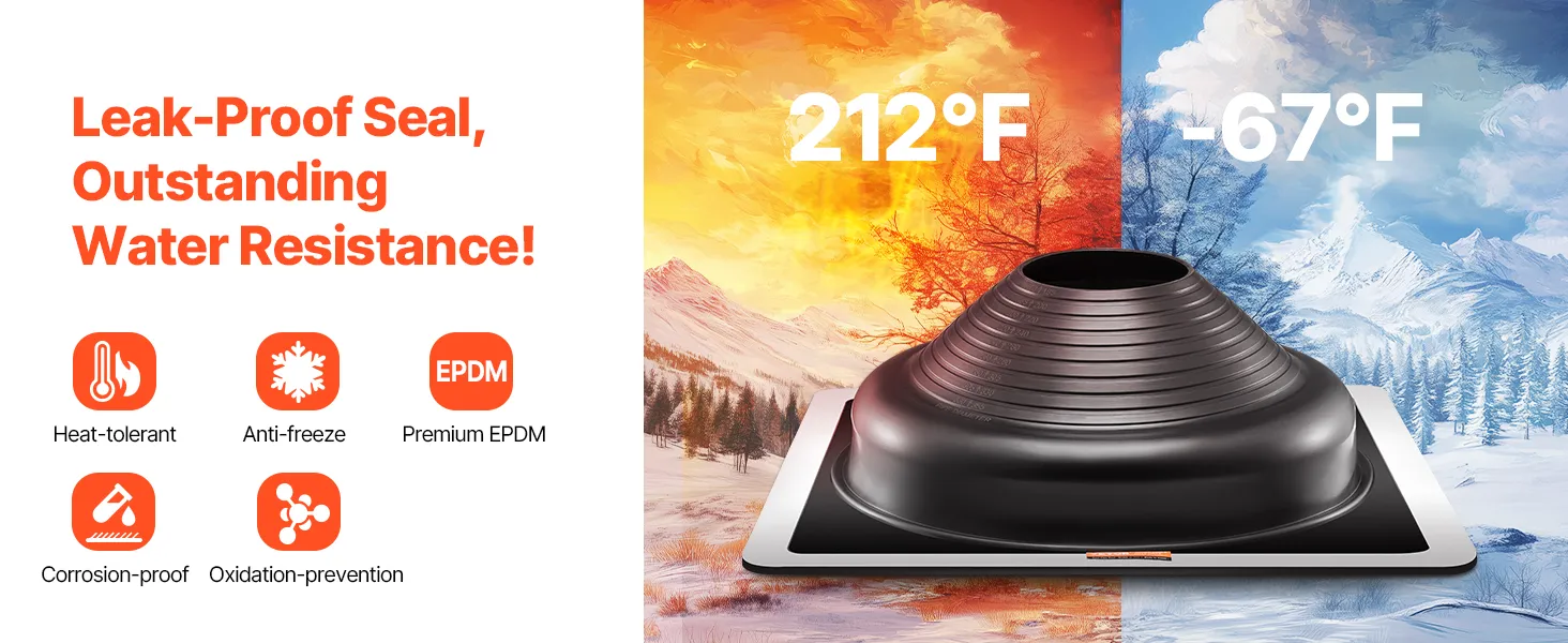 Premium EPDM Boot, Long-lasting Quality: With a temperature range of -67℉ to 212℉, our flexible roof jack pipe boot maintains exceptional tolerance to acids, corrosion, oxidation, rain, snow, and UV rays. It resists cracking and shows long-lasting durability. The boot conforms tightly to the pipe and roof, providing outstanding sealing and leak protection.