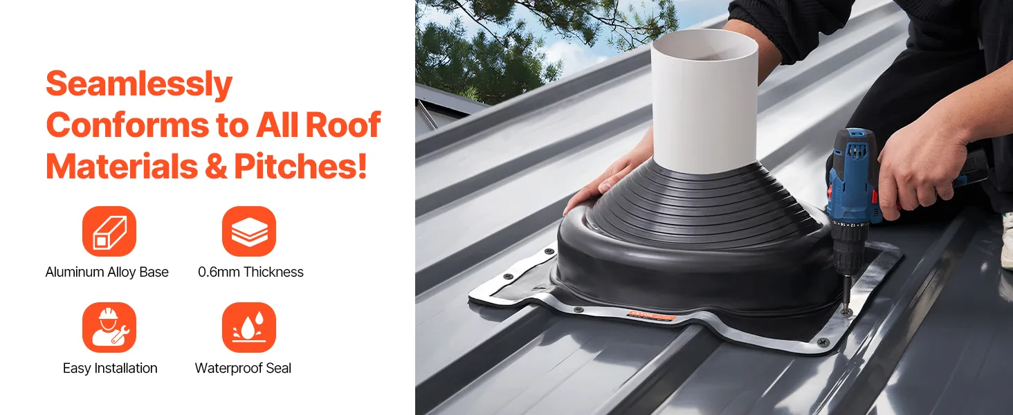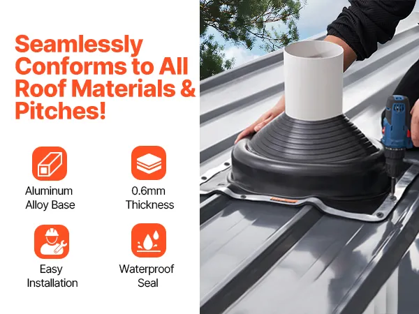Aluminum Square Base, Snug Roof & Pipe Fit: With a 0.6 mm thickness and high flexibility, our roof vent boot is able to adapt seamlessly to both sloped and flat metal roofs, enhancing sealing and waterproof performance.