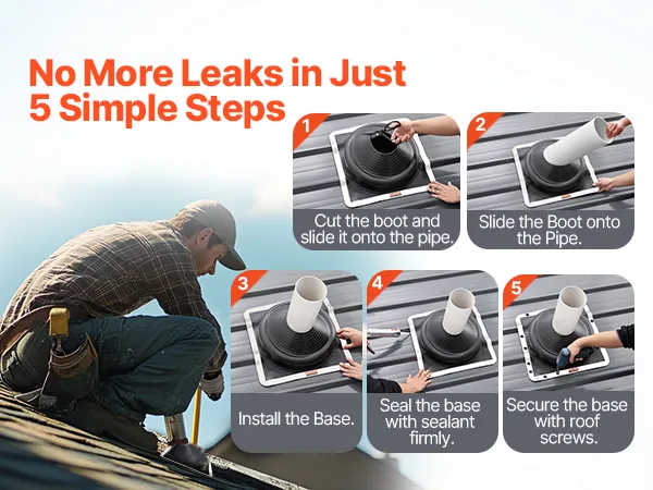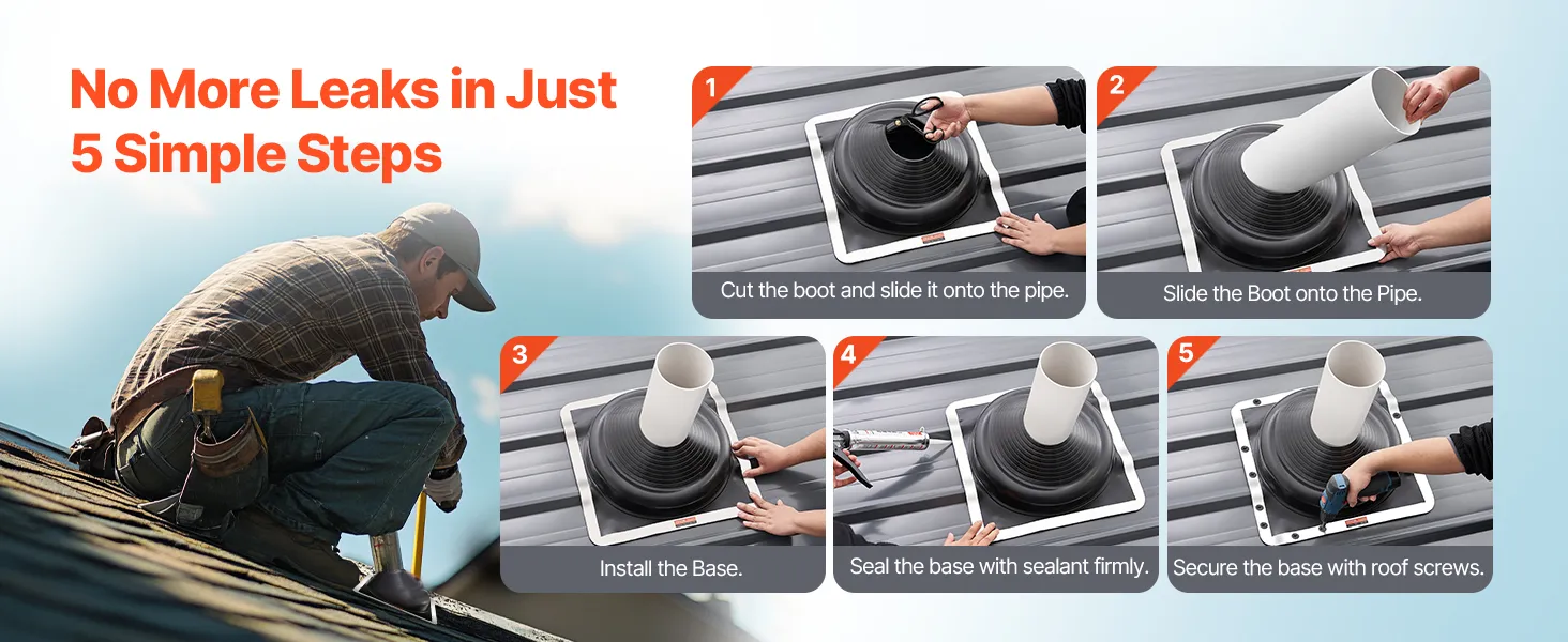 Effortless Installation, Practical Leak Protection: Simply trim the boot to the required size, seal the base with sealant, and secure the waterproof base with screws. The high temp roof boot will then provide reliable, long-lasting protection for your roofing and vent pipes, ensuring a secure, leak-proof seal.