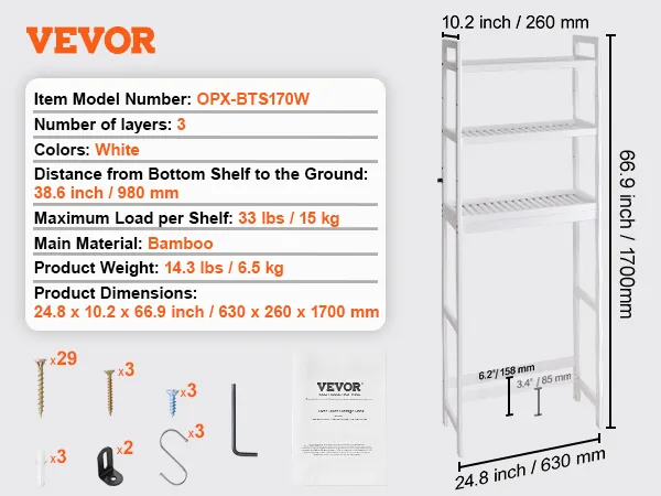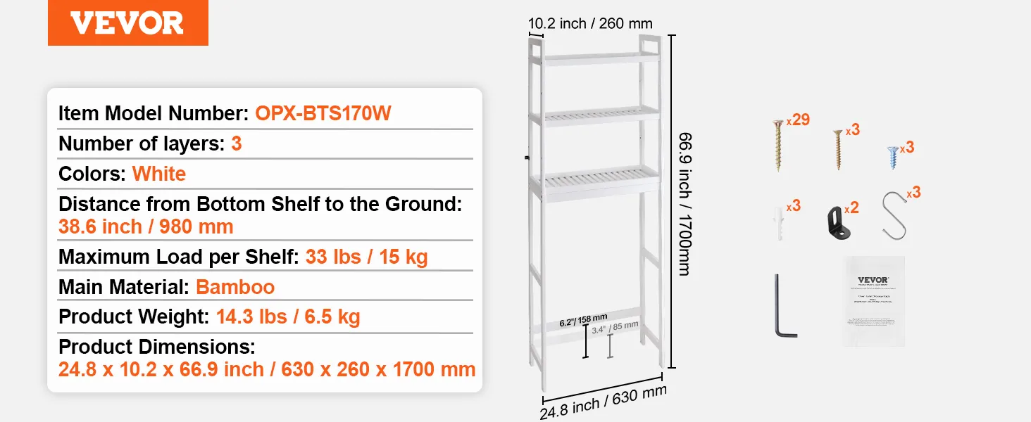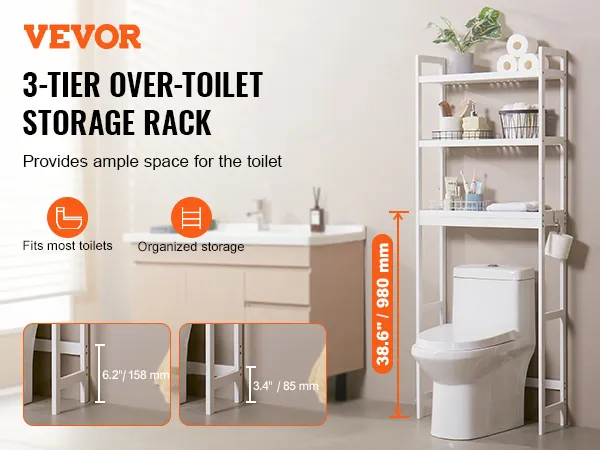 Compatibel met de meeste toiletten: ons frameontwerp is geschikt voor verschillende soorten toiletten. Dit opbergrek boven het toilet meet 630 x 260 x 1700 mm (24,8 x 10,2 x 66,9 inch), waardoor het geschikt is voor badkamers met beperkte ruimte. De onderste dwarsbalk kan worden afgesteld tot 85 mm (3,4 inch) of 158 mm (6,2 inch) boven de grond om ervoor te zorgen dat deze de leidingen niet blokkeert. De onderste plank bevindt zich 980 mm (38,6 inch) boven de vloer, waardoor het toiletdeksel volledig open kan en vrij kan bewegen.