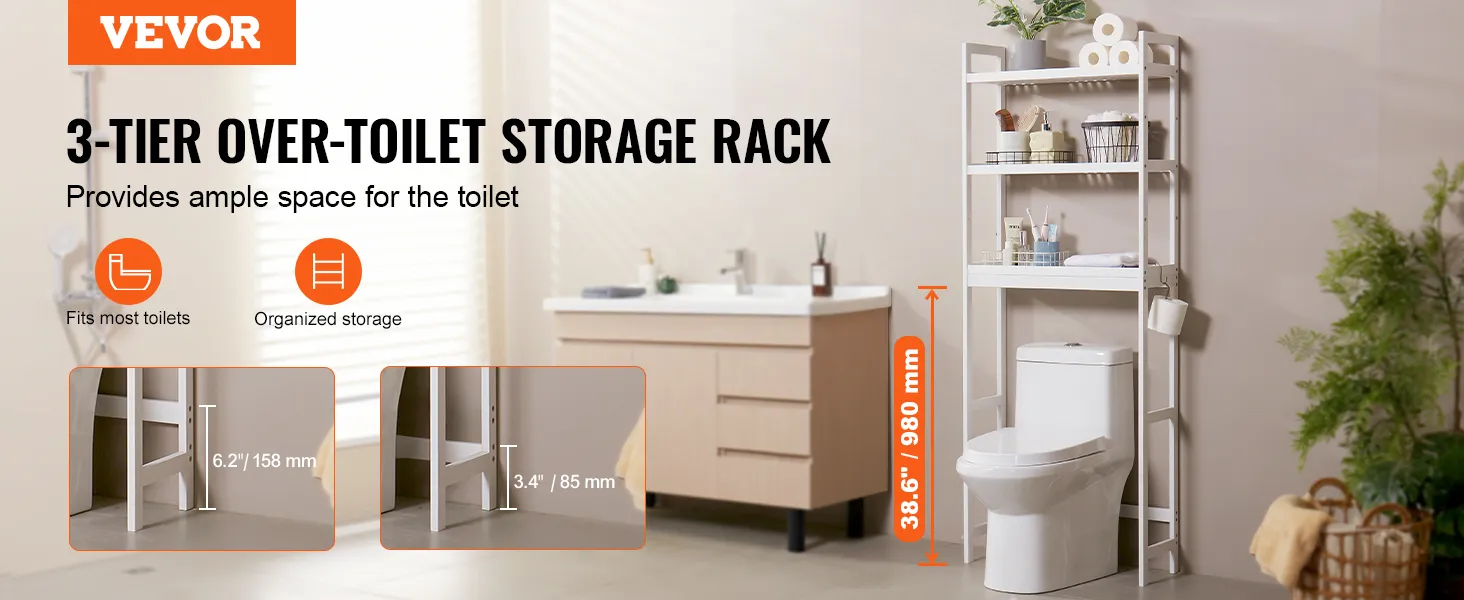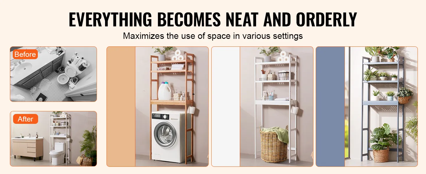 Dit opbergrek is niet alleen te gebruiken boven het toilet, maar ook de verticale ruimte boven wasmachines, potplanten en opbergdozen kan je met ons opbergrek volledig benutten en past goed in badkamers, wasruimtes en balkons.