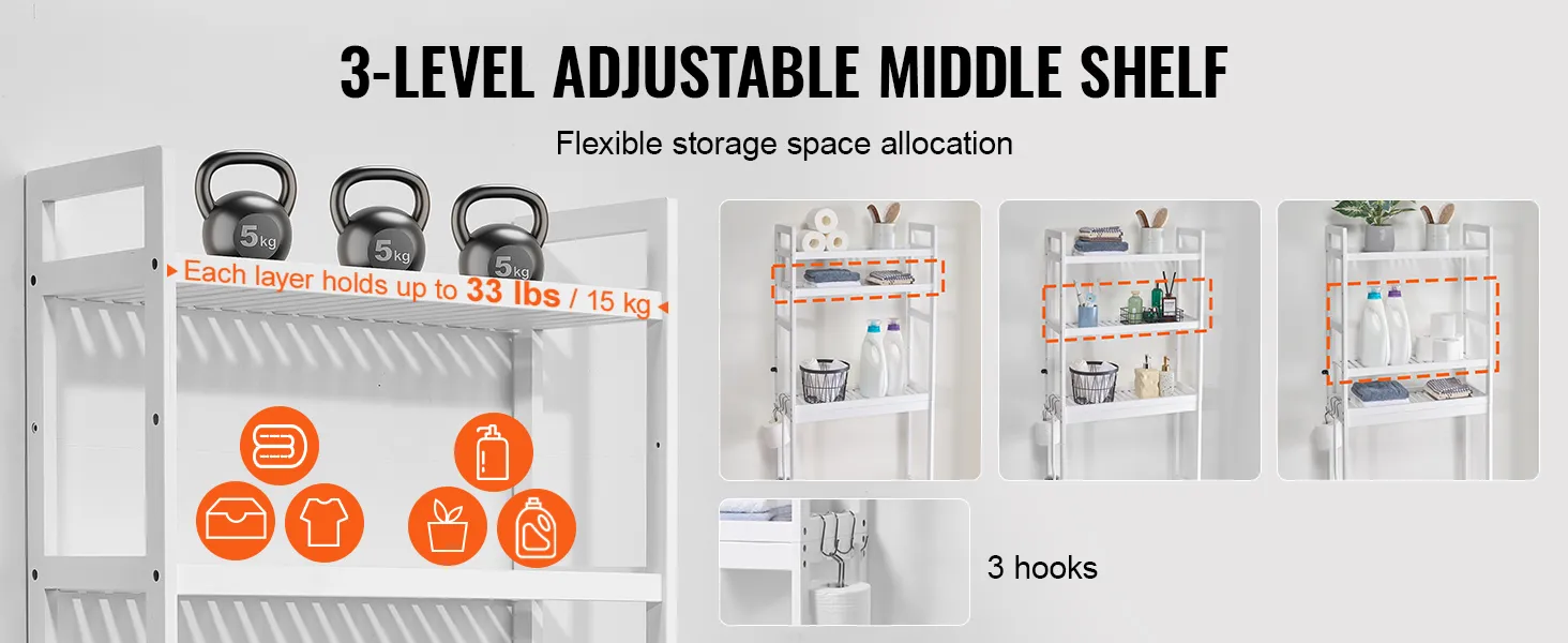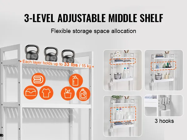 3-laags toiletopbergplank: deze 3-laags opbergplank biedt voldoende opbergruimte met drie vooraf ingestelde hoogteposities voor de middelste plank. Je kunt het midden- en onderste gedeelte flexibel aanpassen aan de hoogte van je spullen, zodat je gemakkelijker bij grote spullen, zoals wasmiddel, kunt. Elke plank kan maximaal 15 kg dragen, zodat u handdoeken, douchegel, potplanten en andere badkamerartikelen netjes kunt opbergen zonder dat u hoeft te bukken om spullen onder de gootsteen vandaan te halen. Het wordt geleverd met drie verwijderbare haken die handig zijn voor het ophangen van tissues, badballen en schuimnetten.