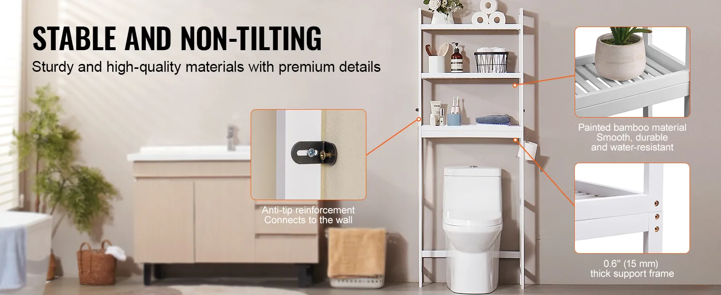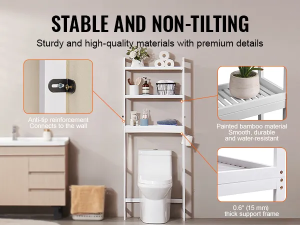 Robuuste en stabiele constructie: twee sets verstevigingen voorkomen dat het opbergrek boven het toilet wiebelt en kantelt, wat de veiligheid garandeert. Het opbergrek is gemaakt van stevig bamboe en afgewerkt met een gelakt oppervlak, waardoor het duurzamer, gladder, waterdicht en schimmelbestendig is. Het zorgvuldig vervaardigde steunframe is 15 mm dik en vervormt niet tijdens gebruik.