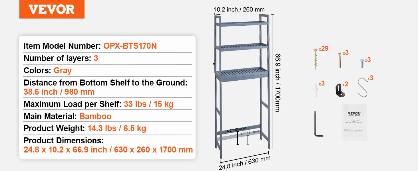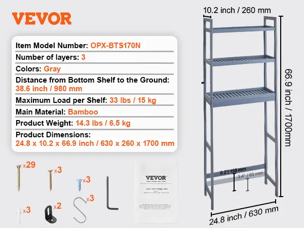 Compatibel met de meeste toiletten: ons frameontwerp is geschikt voor verschillende soorten toiletten. Dit opbergrek boven het toilet meet 630 x 260 x 1700 mm (24,8 x 10,2 x 66,9 inch), waardoor het geschikt is voor badkamers met beperkte ruimte. De onderste dwarsbalk kan worden afgesteld tot 85 mm (3,4 inch) of 158 mm (6,2 inch) boven de grond om ervoor te zorgen dat deze de leidingen niet blokkeert. De onderste plank bevindt zich 980 mm (38,6 inch) boven de vloer, waardoor het toiletdeksel volledig open kan en vrij kan bewegen.