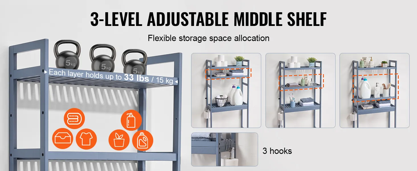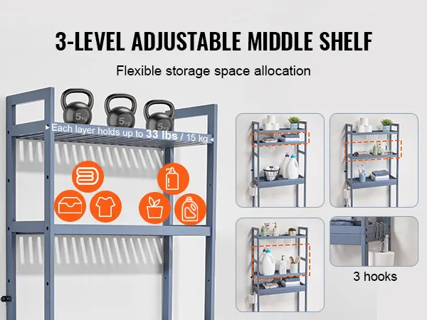 3-laags toiletopbergplank: deze 3-laags opbergplank biedt voldoende opbergruimte met drie vooraf ingestelde hoogteposities voor de middelste plank. Je kunt het midden- en onderste gedeelte flexibel aanpassen aan de hoogte van je spullen, zodat je gemakkelijker bij grote spullen, zoals wasmiddel, kunt. Elke plank kan maximaal 15 kg dragen, zodat u handdoeken, douchegel, potplanten en andere badkamerartikelen netjes kunt opbergen zonder dat u hoeft te bukken om spullen onder de gootsteen vandaan te halen. Het wordt geleverd met drie verwijderbare haken die handig zijn voor het ophangen van tissues, badballen en schuimnetten.