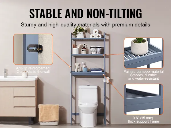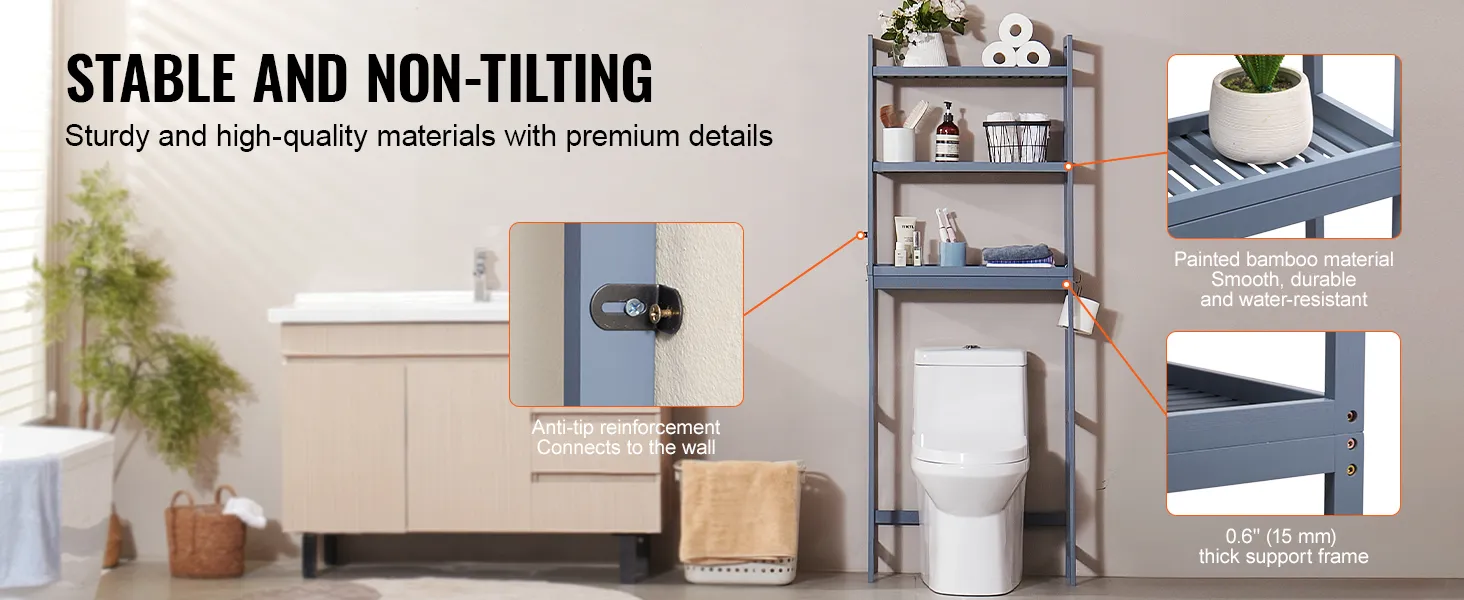 Robuuste en stabiele constructie: twee sets verstevigingen voorkomen dat het opbergrek boven het toilet wiebelt en kantelt, wat de veiligheid garandeert. Het opbergrek is gemaakt van stevig bamboe en afgewerkt met een gelakt oppervlak, waardoor het duurzamer, gladder, waterdicht en schimmelbestendig is. Het zorgvuldig vervaardigde steunframe is 15 mm dik en vervormt niet tijdens gebruik.