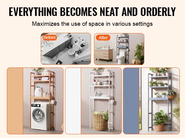 Dit opbergrek kan niet alleen boven het toilet worden gebruikt, maar ook de verticale ruimte boven wasmachines, potplanten en opbergdozen kan met ons opbergrek volledig worden benut en past goed in badkamers, wasruimtes en balkons.