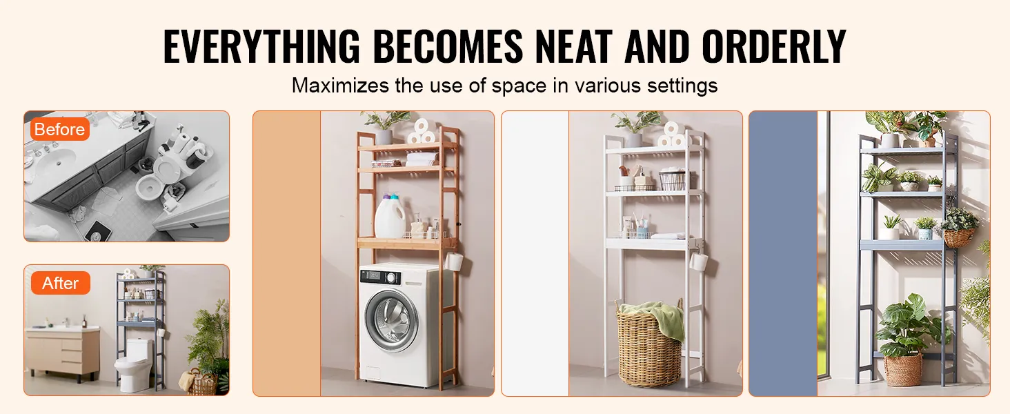 Breed scala aan huishoudelijke toepassingen: deze ruimtebesparing boven het toilet met ruim bodemoppervlak kan ook worden gebruikt boven wasmachines, potplanten en andere voorwerpen om diverse spullen, schoenen, boeken, planten, kruiden en kleine apparaten op te bergen. Het is verkrijgbaar in drie kleuren: grijs, wit en bamboe, met eenvoudige lijnen die uw woonkamer, badkamer, keuken en balkon netjes houden en een vleugje elegantie toevoegen aan uw interieur.