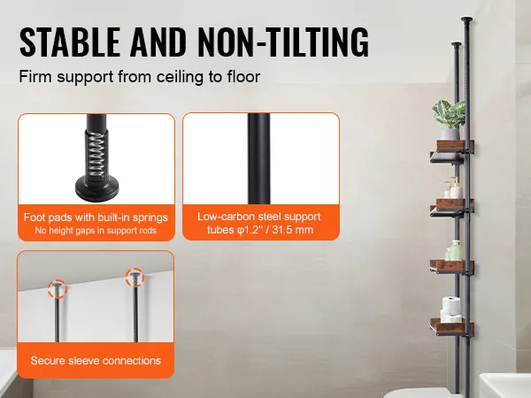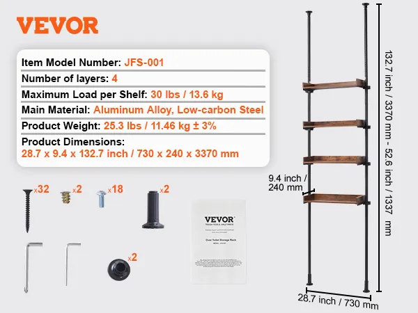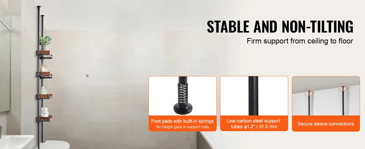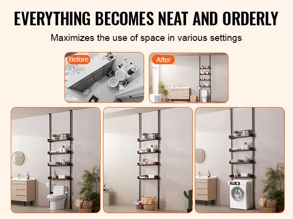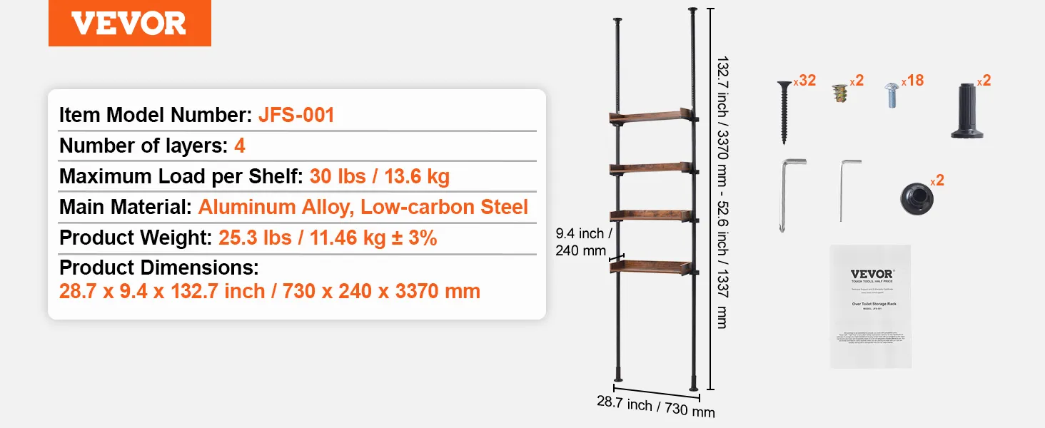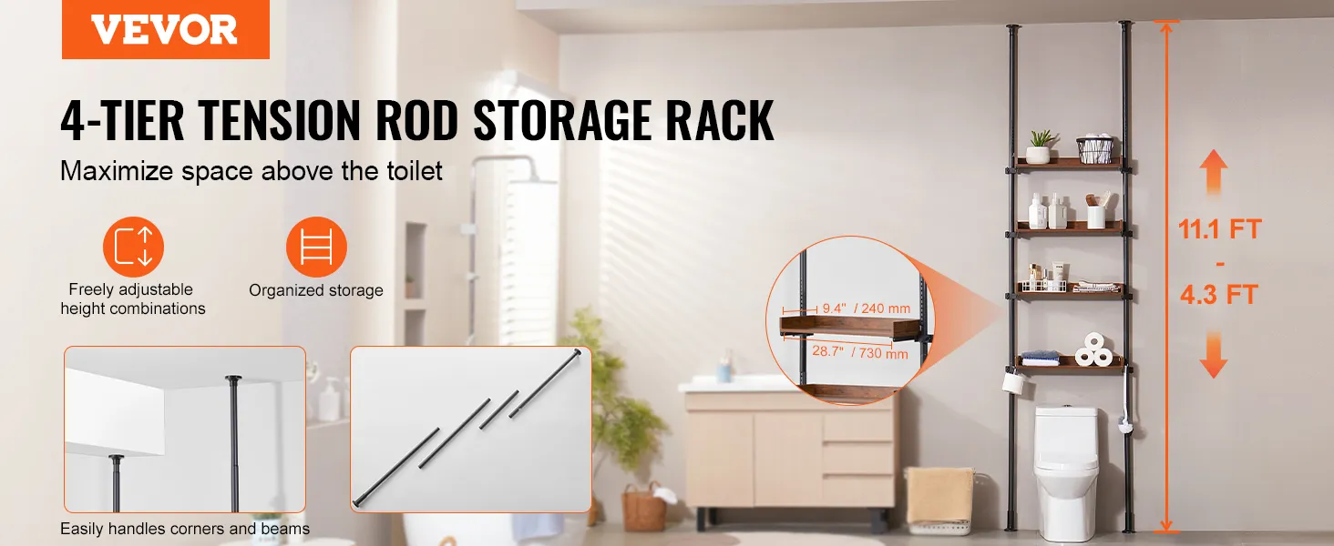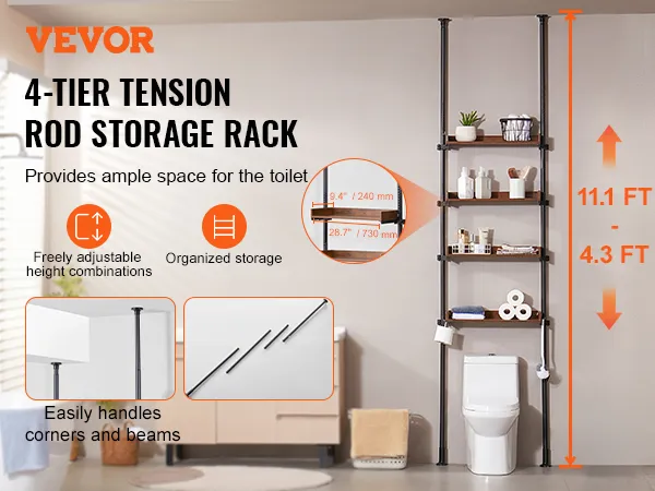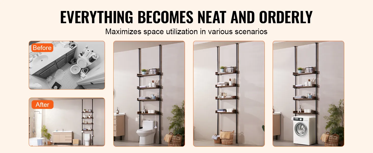 Compatible with Most Toilets & Ceilings: This over the toilet storage rack uses a tension floor-to-ceiling pole structure, providing strong support between the floor and ceiling. It comes with one adjustable tube with a spring button, two long tubes, and one short tube that can be freely combined. The maximum height can reach 11.1' (3.4 m), and the minimum height is 4.3' (1.3 m), with a length of 28.7" (730 mm) and a width of 9.4" (240 mm). It fully utilizes vertical space and is suitable for various ceiling heights, even corner beams, blending seamlessly into the bathroom.