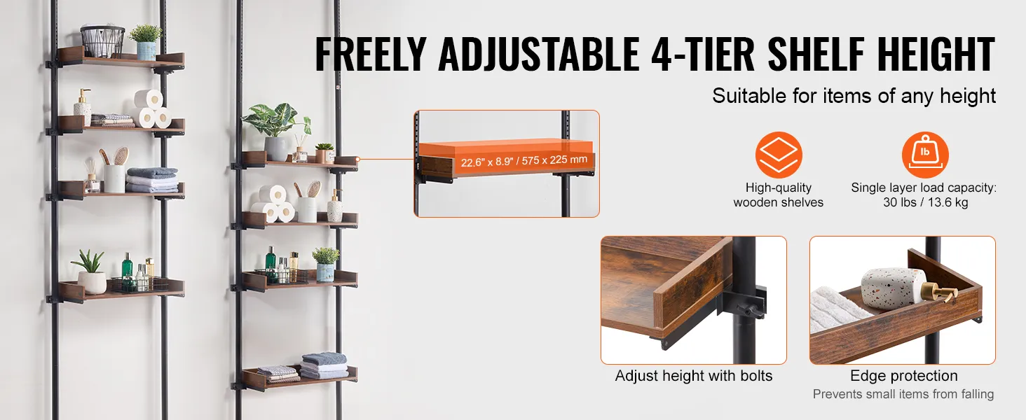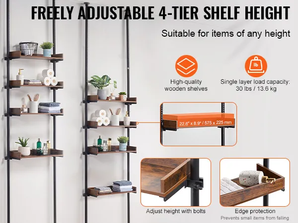 4 Flexible Adjustable Storage Shelves: The four wooden shelves with guardrails can be flexibly adjusted according to the height of your items, ensuring the organizer rack doesn't hit your head when using the toilet. Tall items can also be easily accommodated. Each shelf can hold up to 30 lbs (13.6 kg), keeping towels, shower gel, and other toiletries organized and preventing items from falling off. Adjustments can be made by sliding the bolts up and down and locking them in place.