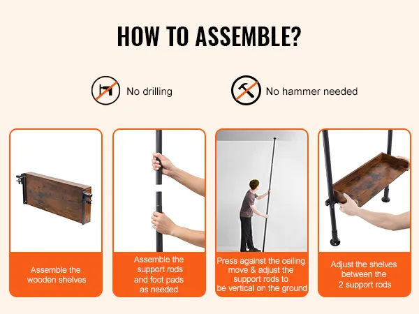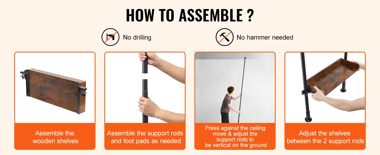 Easy Assembly: Even if you are not handy, you can easily assemble and set up this above toilet stand. The key step is to position the support poles vertically between the floor and ceiling, making sure to rotate the foot pads counterclockwise for extra stability. The rest of the steps require no drilling. Just follow the clear instructions and use the included tools for assembly.