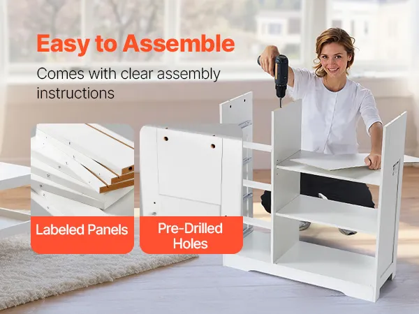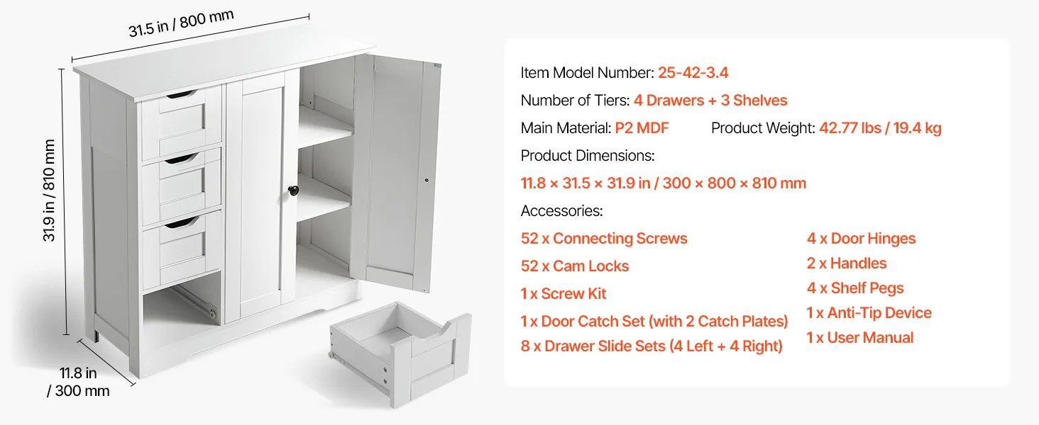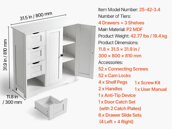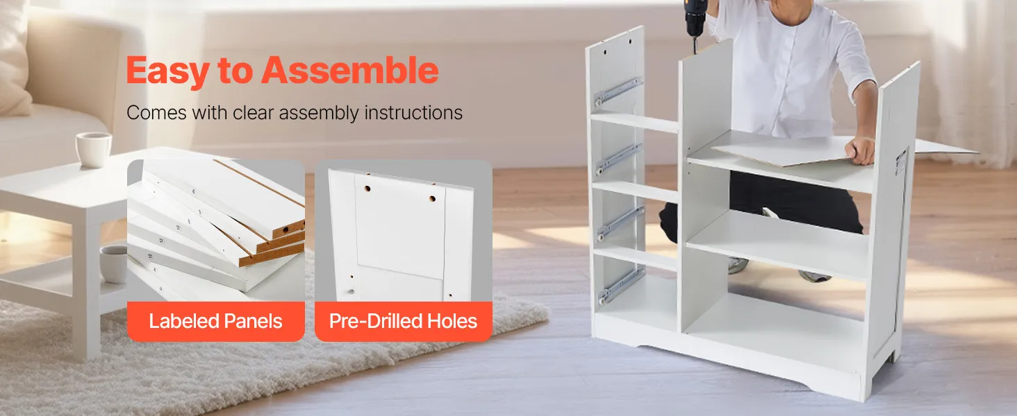 De vrijstaande opbergkast wordt geleverd met alle benodigde accessoires en voorgeboorde gaten. Alle onderdelen zijn duidelijk genummerd om de montage zo eenvoudig en eenvoudig mogelijk te maken.