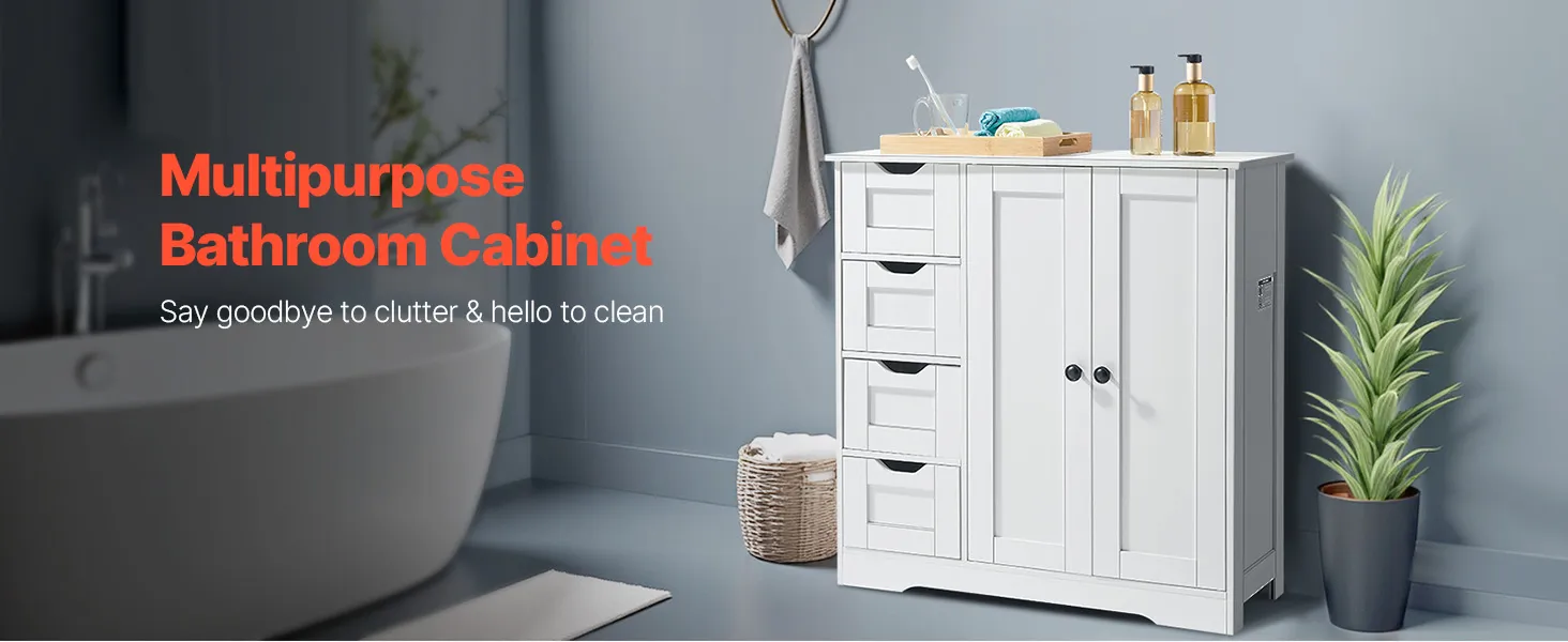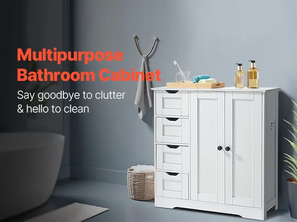 Ruime opbergruimte: Deze badkamerkast, met afmetingen van 30 x 80 x 81 cm, heeft vier lades en drie planken. Hij biedt voldoende ruimte voor handdoeken, toiletpapier, zeep, wasmiddel, een föhn, cosmetica en douchebenodigdheden. De open bovenkant kan worden gebruikt om kunstwerken of vazen te presenteren.