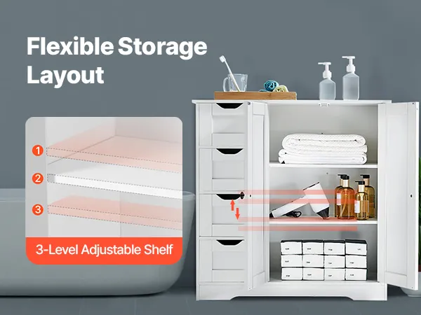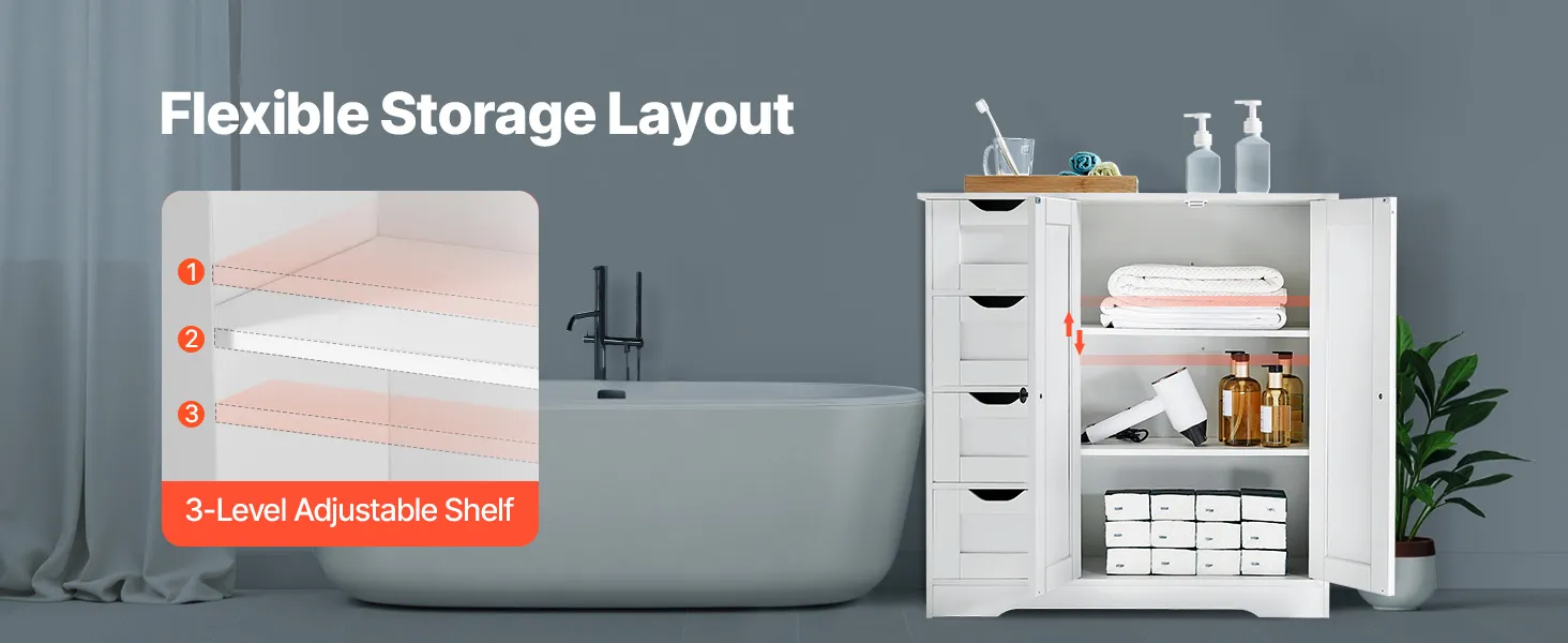 De voorgeboorde gaten in de bovenste plank zorgen voor een eenvoudige hoogteverstelling op drie niveaus. Ze bieden ruimte aan diverse artikelen, zoals zeepbakjes, huidverzorgingsproducten, wasmiddel en handdoekmandjes. Dit ontwerp vergroot de functionaliteit van onze badkamerkast aanzienlijk.