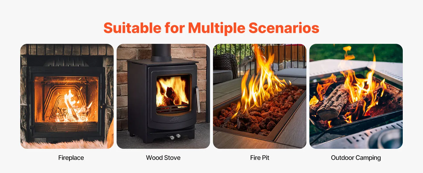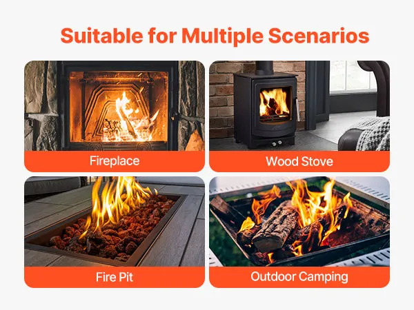 Deze asemmer voor open haarden is veelzijdig en geschikt voor diverse toepassingen, waaronder open haarden thuis, houtkachels, vuurkorven buiten en het aansteken van kampvuren. Hij voldoet effectief aan een breed scala aan gebruiksvereisten.