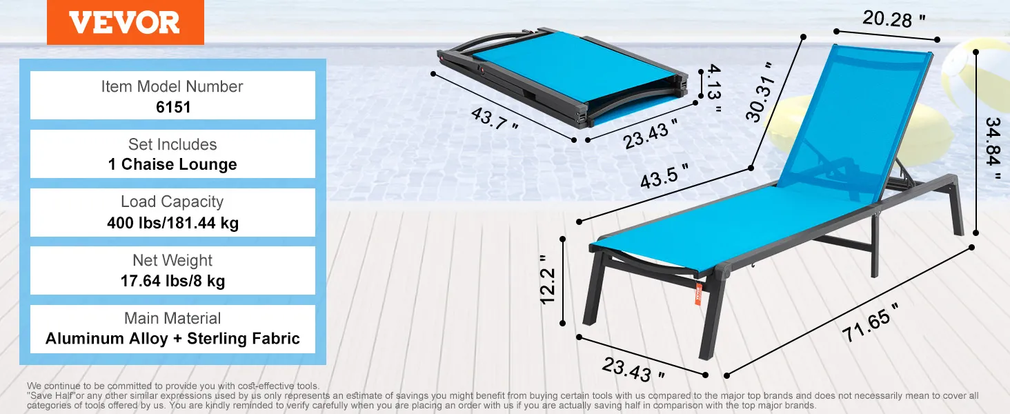 Het kost slechts 3 minuten om de tuinmeubelen op te zetten. U kunt het frame uitvouwen, vastzetten en klaar. Deze snelle installatie zorgt ervoor dat u minder tijd kwijt bent aan voorbereidingen en meer tijd hebt om te genieten van uw tijd buiten. De VEVOR chaise lounge stoel is uw go-to oplossing voor spontane ontspanning buitenshuis.
