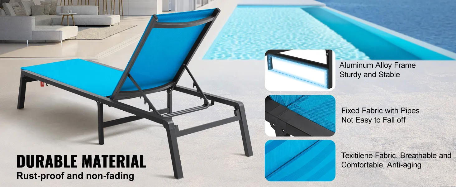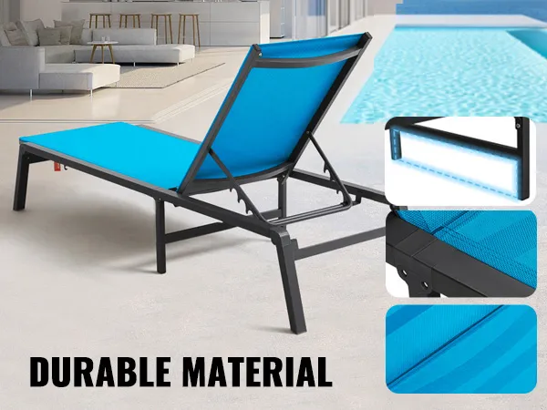 Onze chaise longue stoel is gebouwd om lang mee te gaan. Het heeft een stevig frame van aluminiumlegering, dat tot 400 lbs kan dragen. De waterdichte en roestbestendige constructie zorgt ervoor dat het de tand des tijds doorstaat! De stof staat bekend om zijn ademend vermogen en comfort. Het is bestand tegen vervorming en slijtage, en biedt uitstekend comfort en ondersteuning voor eindeloze buitenavonturen.
