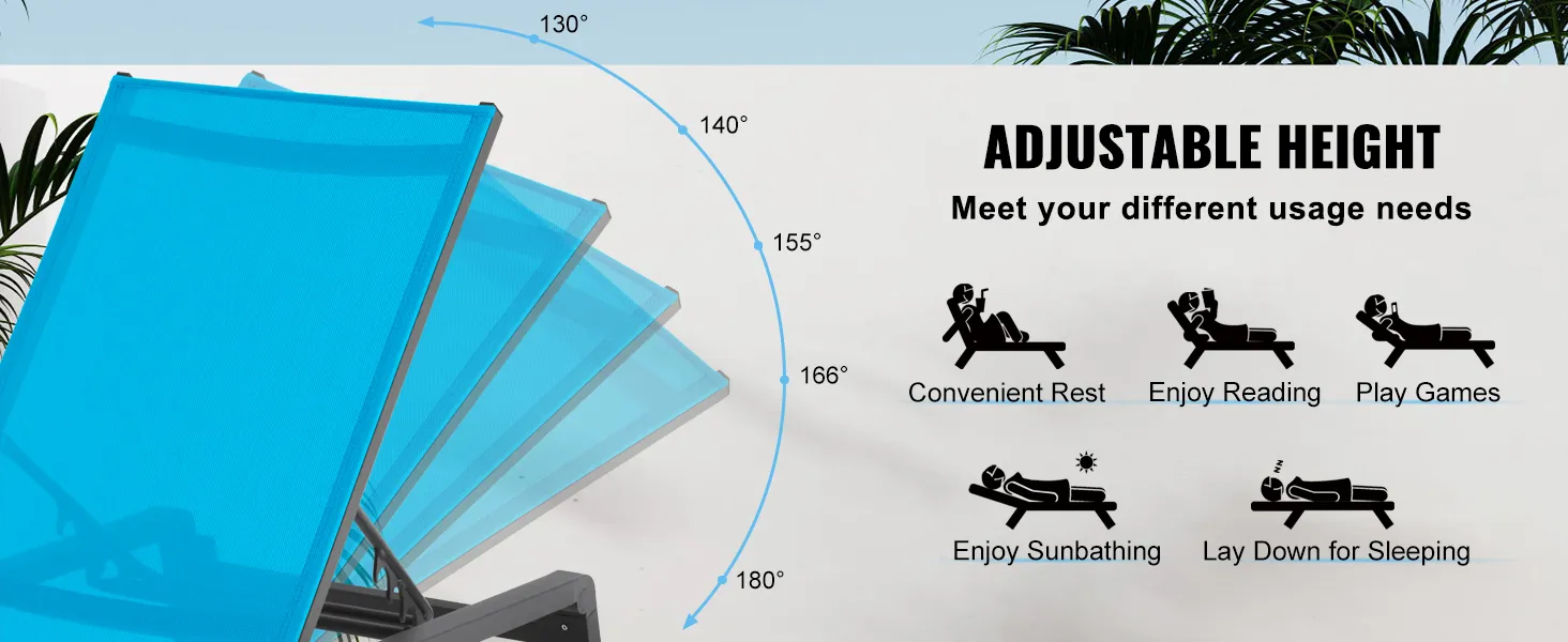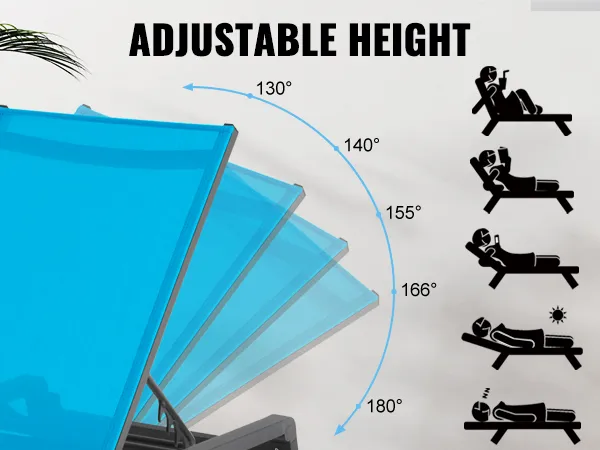 Onze outdoor patio lounge stoel heeft 5 verstelbare hoeken. Het maakt niet uit of u van slapen, lezen, spelletjes spelen, zonnebaden of dutten houdt. De ademende stof zorgt elke keer voor welsprekende ontspanning. U kunt uw favoriete hoek aanpassen en comfortabel en in uw eigen stijl van het buitenleven genieten.