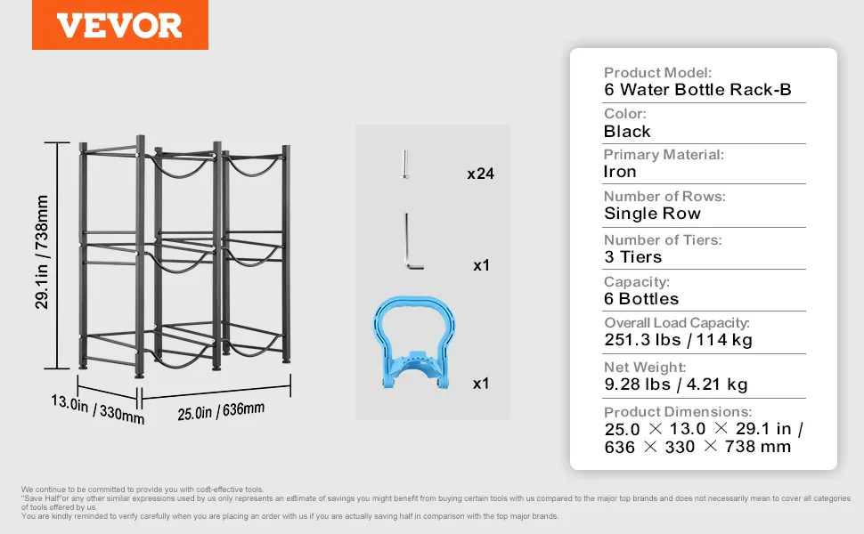 This 3-tier water jug holder measures 25 x 13 x 29.1 in, holds up to 6 bottles and supports up to 251.3 lbs. Its minimalist industrial design fits various interiors, making it an ideal choice for any space.