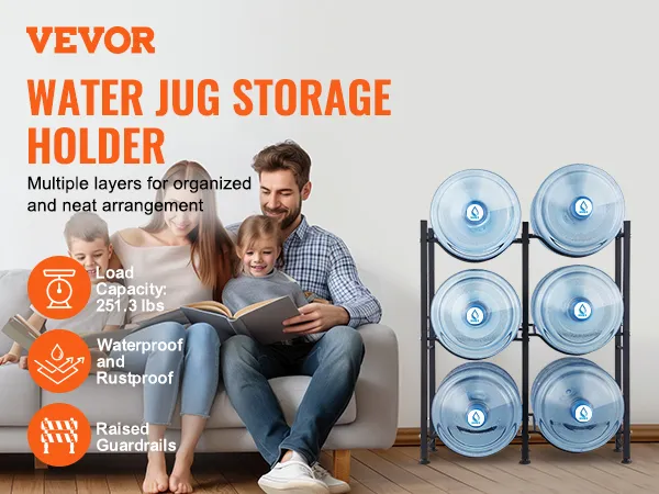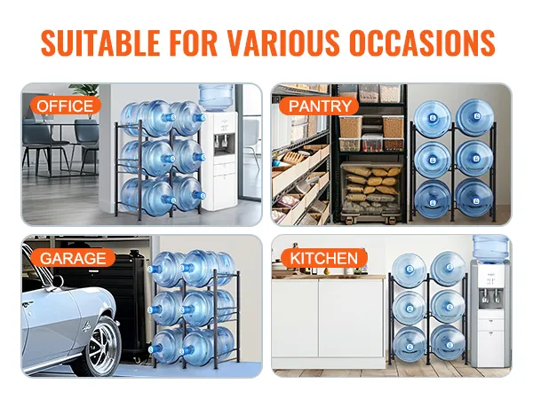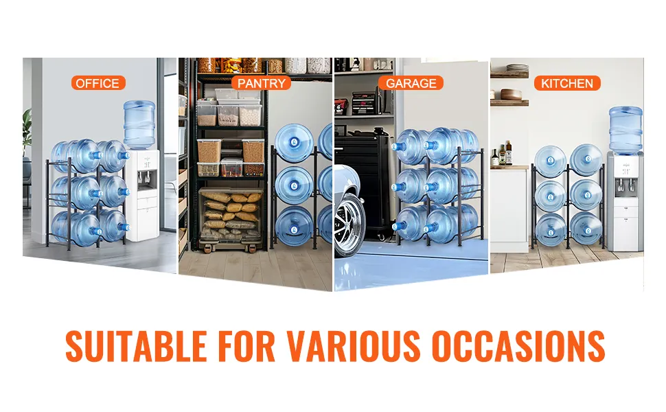 Versatile Use: The water jug stand is ideal for living rooms, storage rooms, kitchens, garages, food pantries, closets, laundry rooms, gyms, and offices. This rack helps you organize and maximize space efficiently.