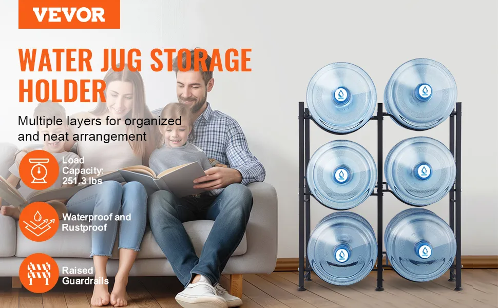 Thoughtful Design: The water gallon holder includes high guardrails to prevent taller buckets from falling, shelf grooves to keep bottles secure, and adjustable feet to protect floors and stabilize the rack on uneven surfaces. Handles make bottles placement easy.