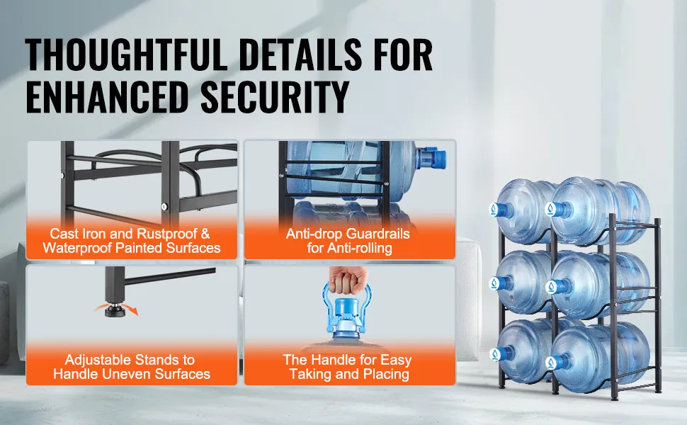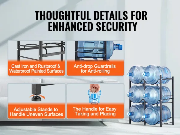The water jug rack is made from durable cast iron with a rust-resistant finish. High guardrails and shelf grooves prevent bottles from sliding. Adjustable feet and an anti-tip feature keep the rack stable on uneven floors. Handles make lifting and placing bottles easy.