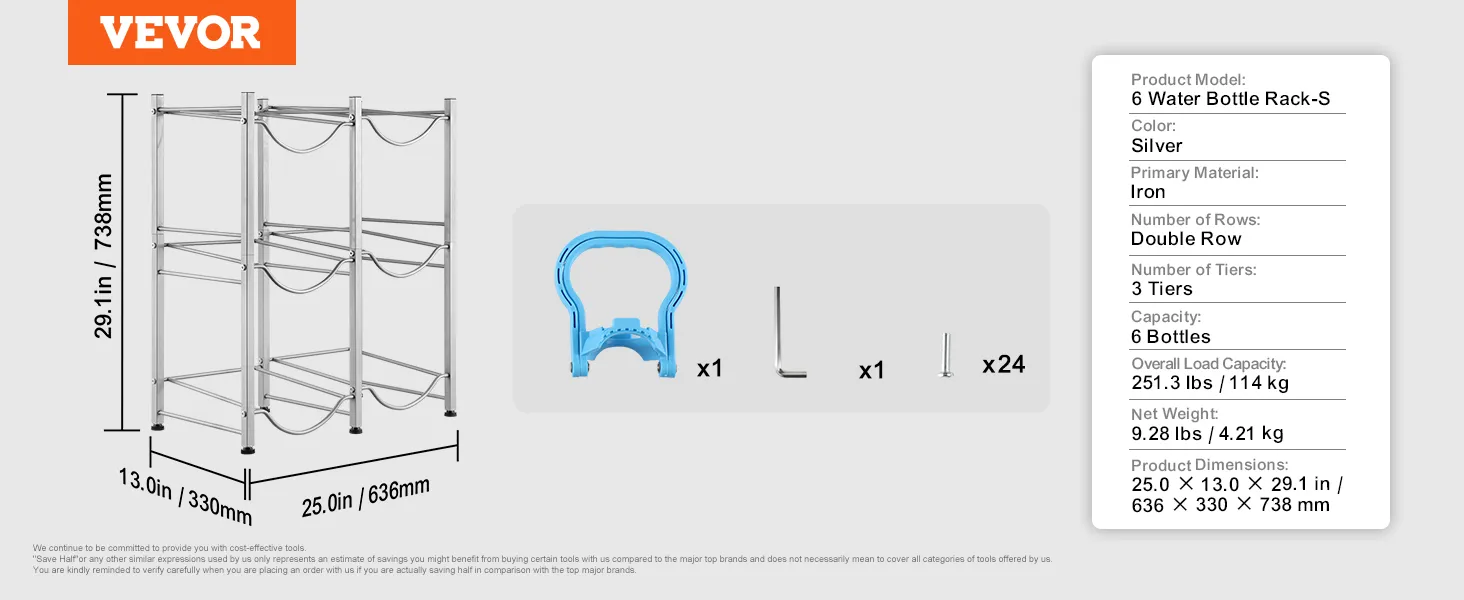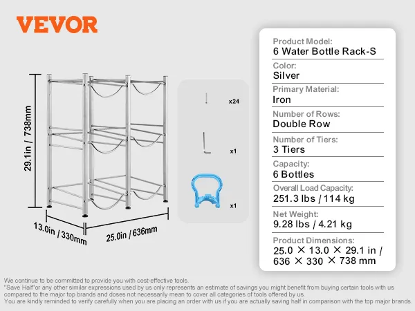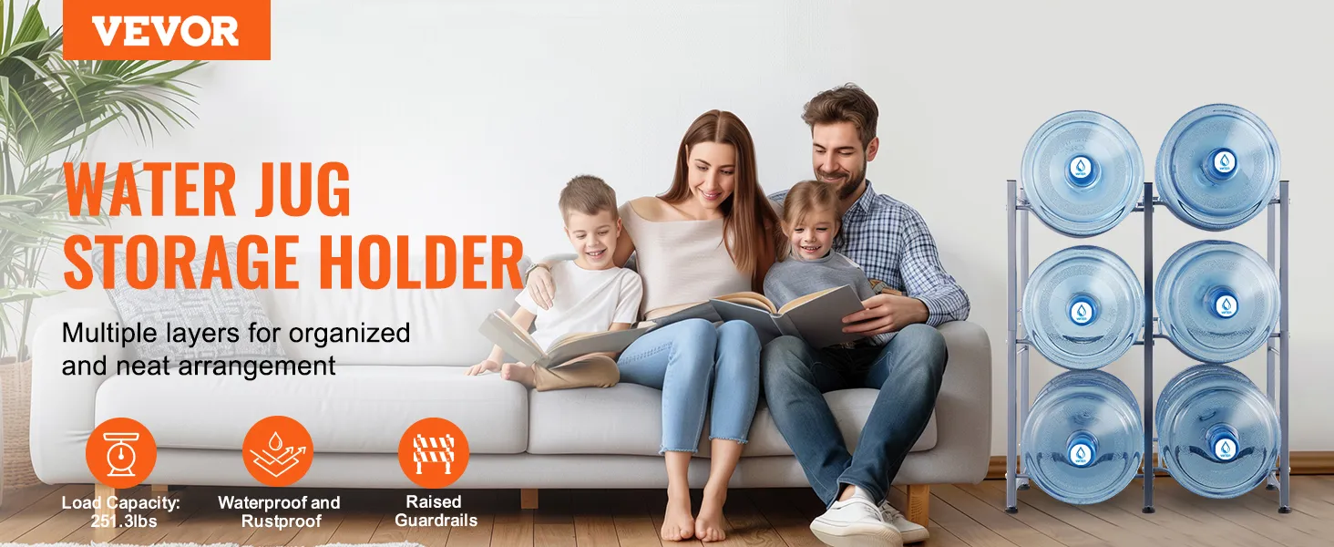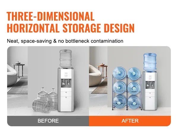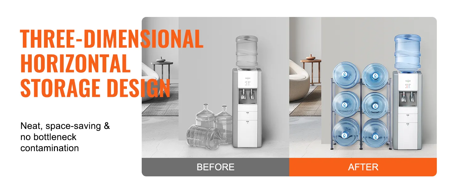Meerlaagse opslag: deze waterkanhouder met drie niveaus meet 25,0 x 13,0 x 29,1 inch (636 x 330 x 738 mm). De verticale constructie biedt plaats aan maximaal 6 flessen en ondersteunt maximaal 114 kg (251,3 lbs). Hij bespaart ruimte door de flessen netjes in een hoek te stapelen. Het eenvoudige industriële ontwerp past bij veel interieurstijlen en is ideaal voor elke kamer!