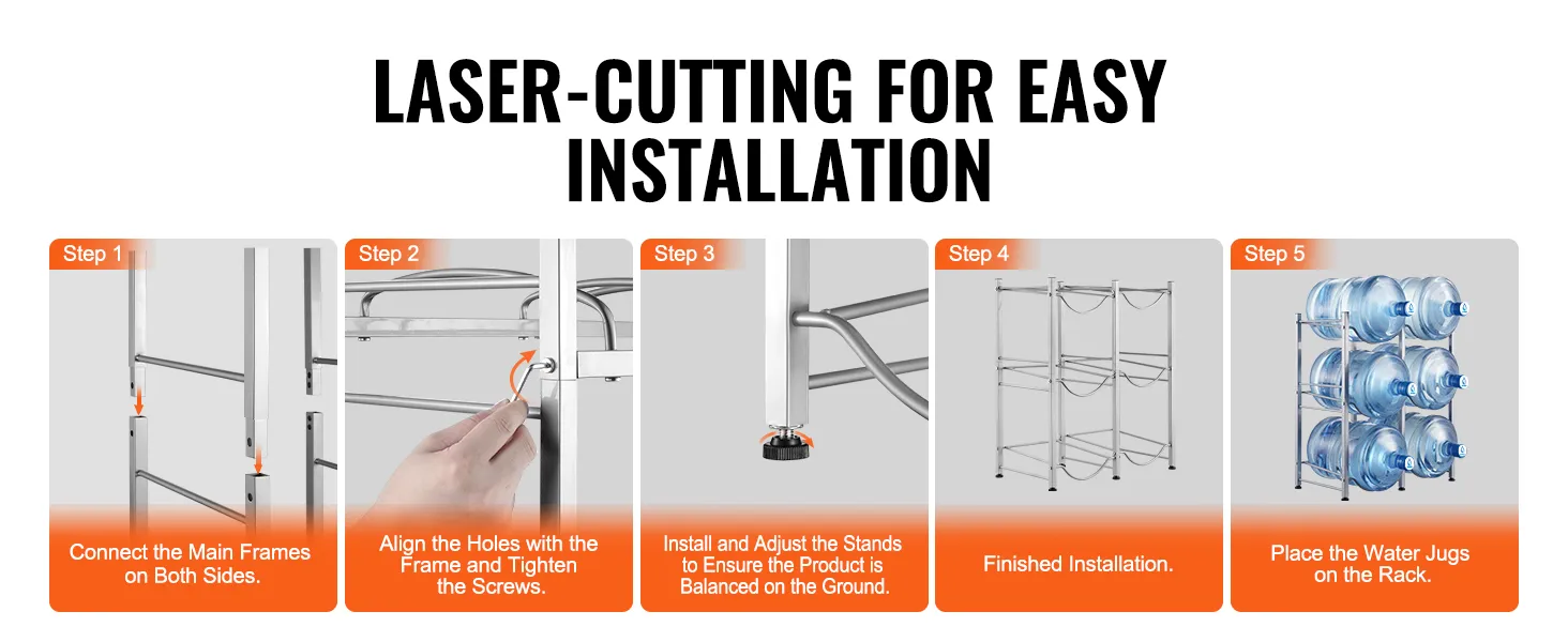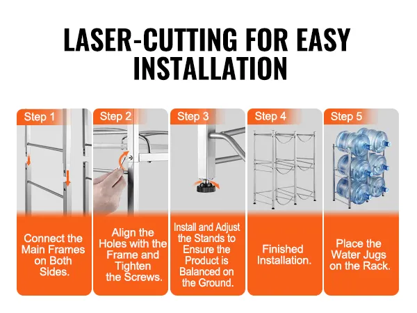 Eenvoudige montage: ons waterkannenrek is voorzien van lasergesneden gaten voor een nauwkeurige en eenvoudige montage. Het frame kan in het gewenste aantal niveaus worden gemonteerd en wordt geleverd met instructies voor een snelle montage.
