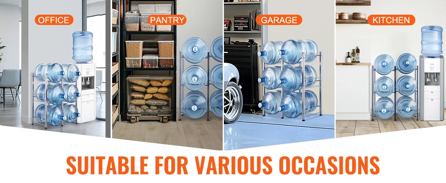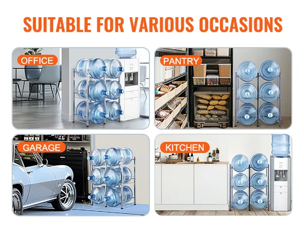 De waterkanstandaard is ideaal voor woonkamers, opslagruimtes, keukens, garages, bijkeukens, kasten, wasruimtes, sportscholen en kantoren. Het biedt een efficiënte oplossing voor het bewaren van meerdere flessen.