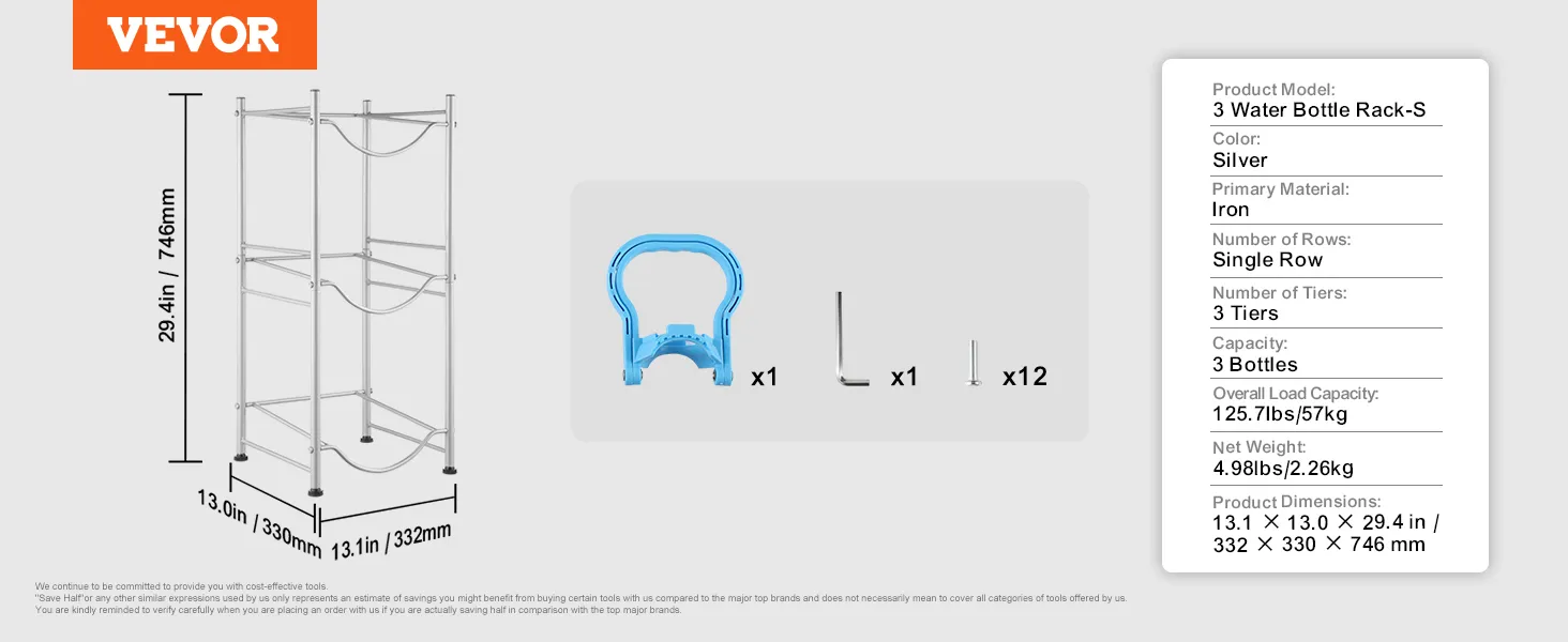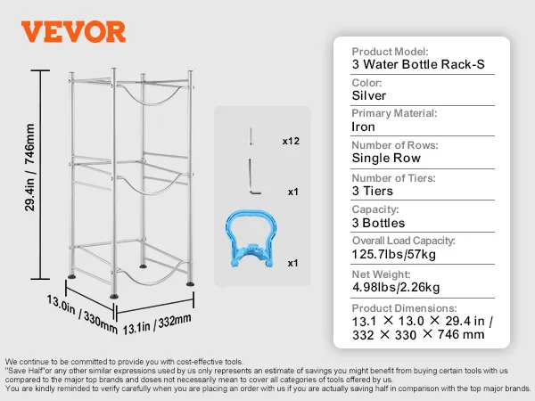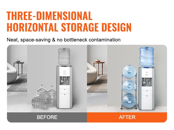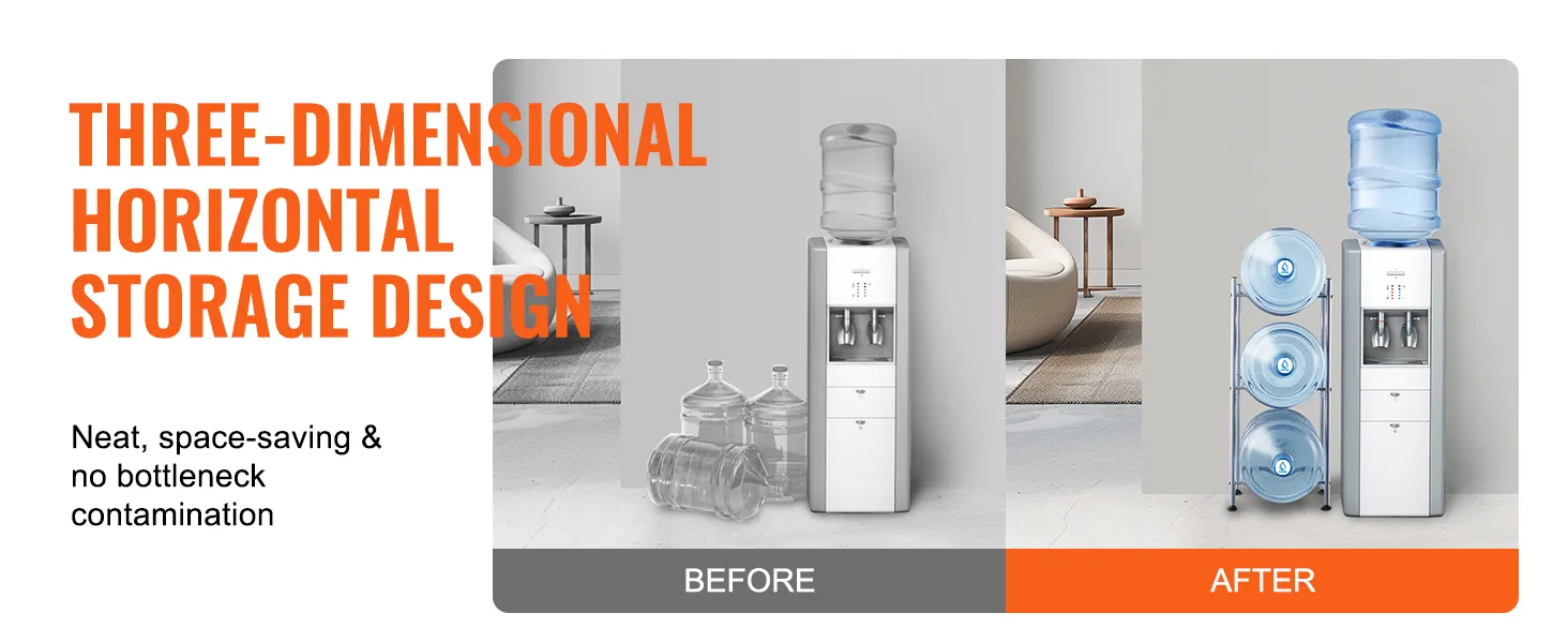 Multi-tier opslag: deze 3-laags waterkanhouder meet 13,1 x 13,0 x 29,4 inch (332 x 330 x 746 mm). Het verticale ontwerp biedt plaats aan maximaal 3 flessen en ondersteunt maximaal 57 kg. Hij bespaart ruimte door emmers netjes in een hoek te stapelen. Het eenvoudige industriële ontwerp past bij verschillende inrichtingsstijlen en maakt hem ideaal voor elke kamer!