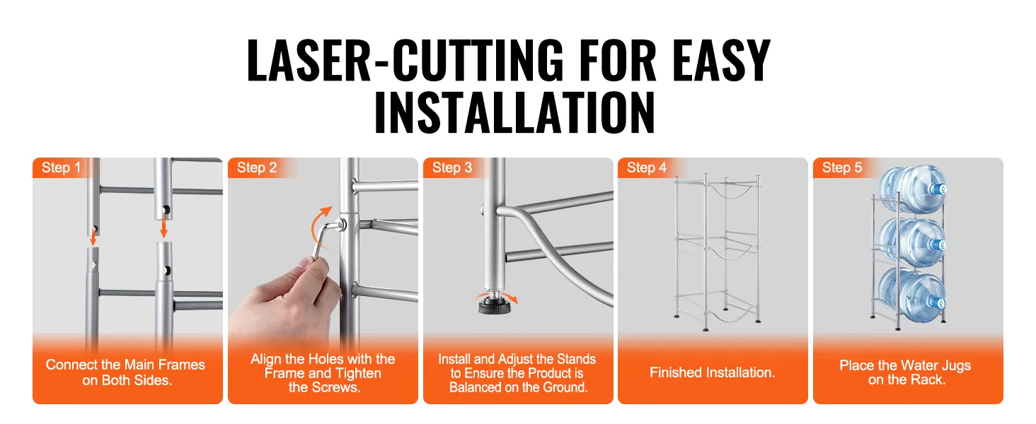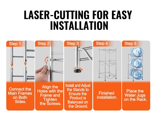 Eenvoudige installatie: ons waterkannenrek is voorzien van lasergesneden gaten voor nauwkeurige en eenvoudige montage. Het rek kan in het gewenste aantal niveaus worden opgebouwd en wordt geleverd met een handleiding voor een snelle montage.