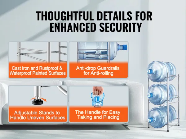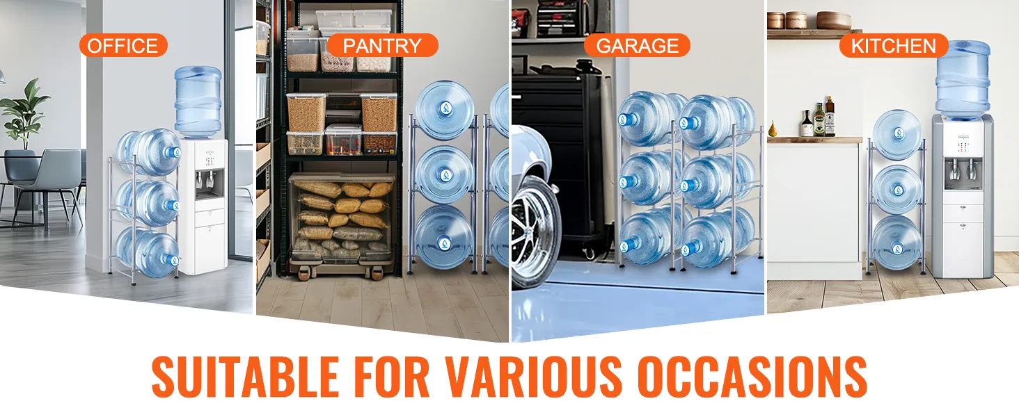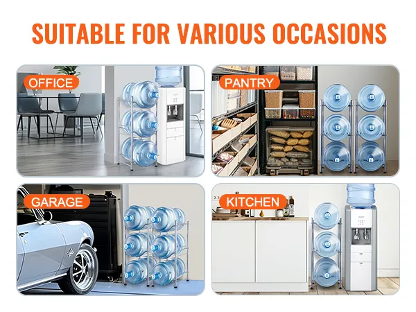 De waterkanstandaard is ideaal voor woonkamers, opslagruimtes, keukens, garages, bijkeukens, kasten, wasruimtes, sportscholen en kantoren. Het biedt een efficiënte oplossing voor het bewaren van meerdere flessen.