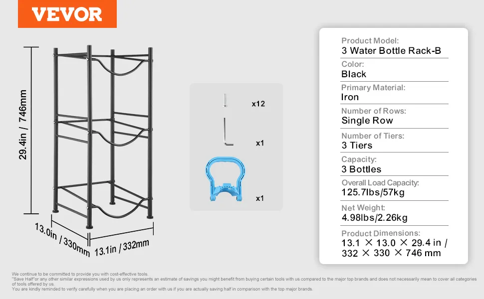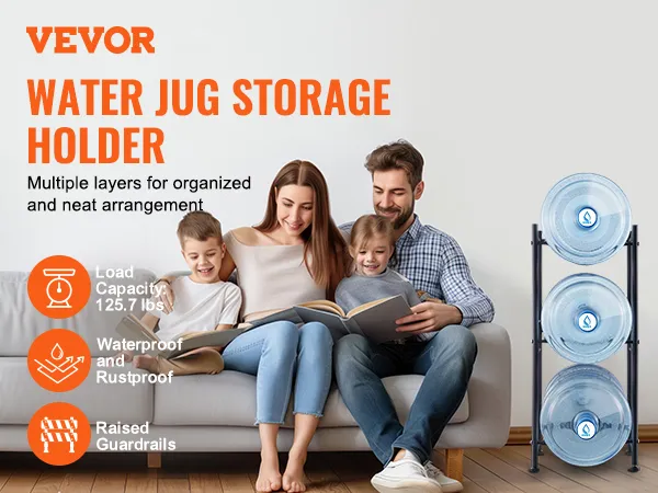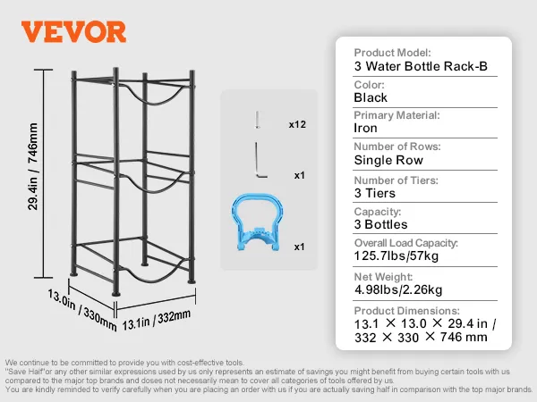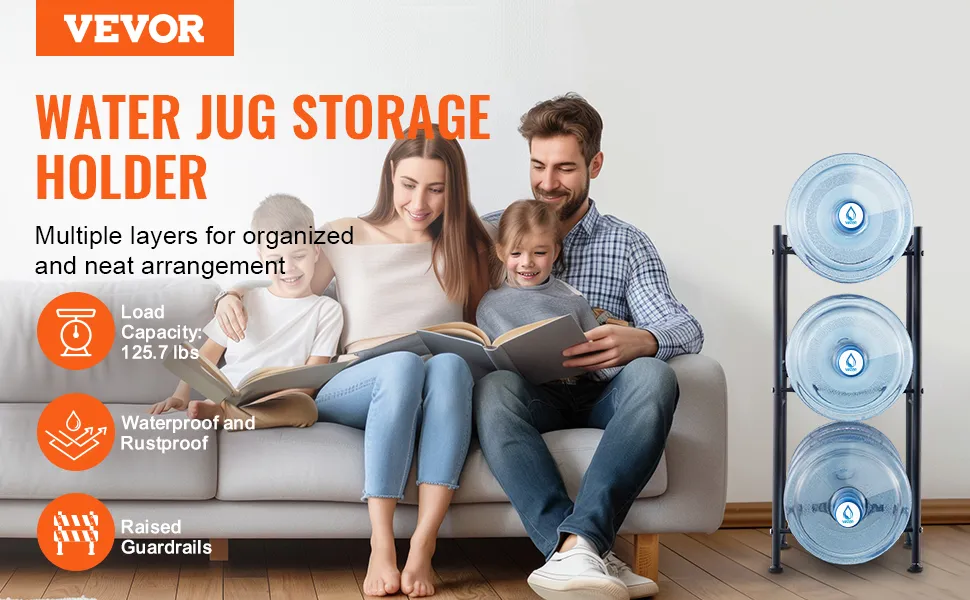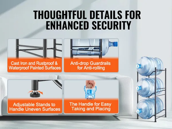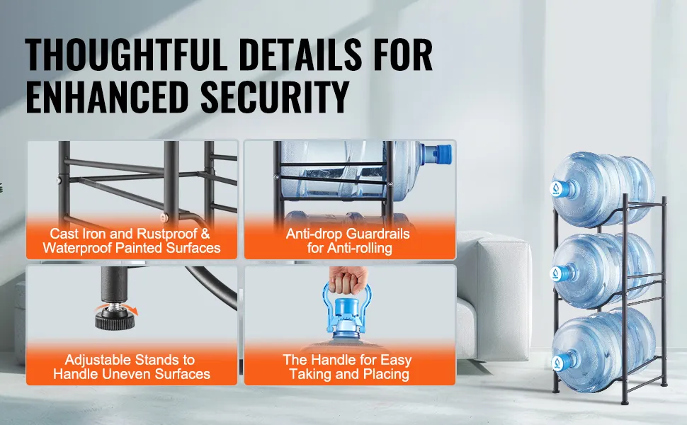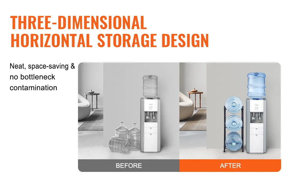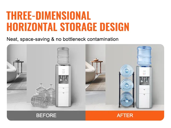 Meerlaagse opslag: deze waterkanhouder met drie niveaus meet 13,1 x 13,0 x 29,4 inch (332 x 330 x 746 mm). Het verticale ontwerp biedt plaats aan maximaal 3 flessen en ondersteunt maximaal 57 kg. Hij bespaart ruimte door de potten netjes in een hoek te stapelen. Het eenvoudige industriële ontwerp past bij veel interieurstijlen en is ideaal voor elke kamer!
