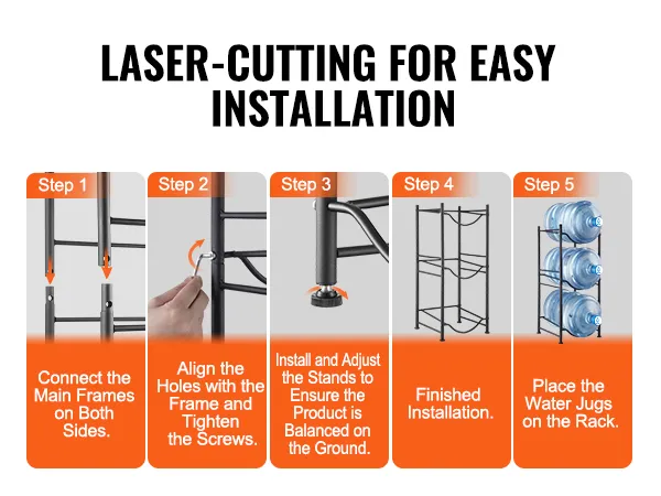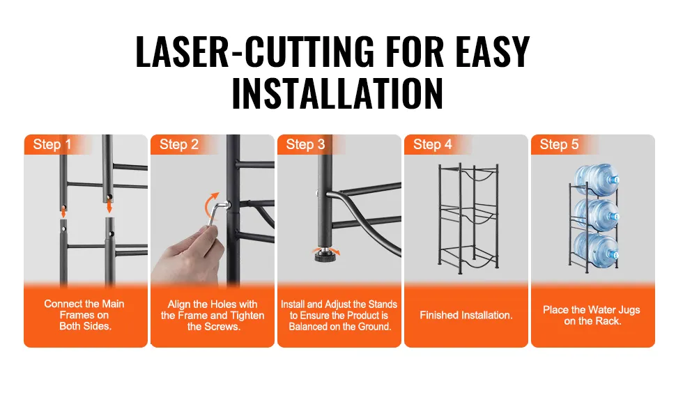 Eenvoudige montage: ons waterkannenrek is voorzien van lasergesneden gaten voor een nauwkeurige en eenvoudige montage. Het frame kan in het gewenste aantal niveaus worden gemonteerd en wordt geleverd met instructies voor een snelle montage.