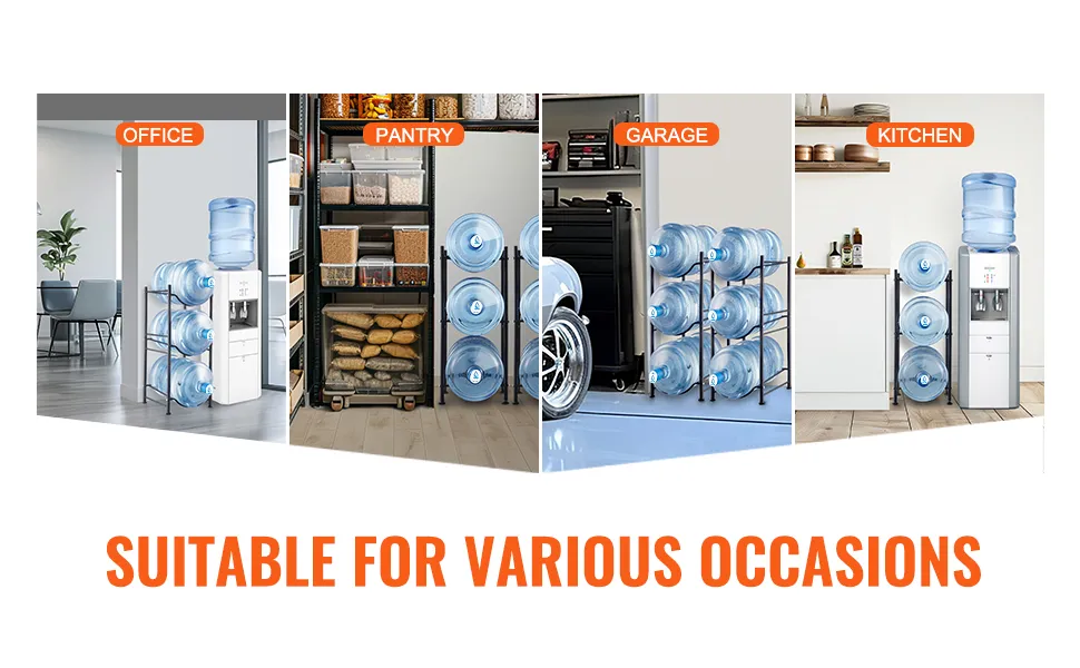 De waterkanstandaard is ideaal voor woonkamers, opslagruimtes, keukens, garages, bijkeukens, kasten, wasruimtes, sportscholen en kantoren. Het biedt een efficiënte oplossing voor het bewaren van meerdere flessen.