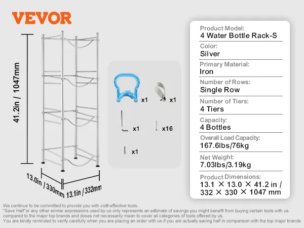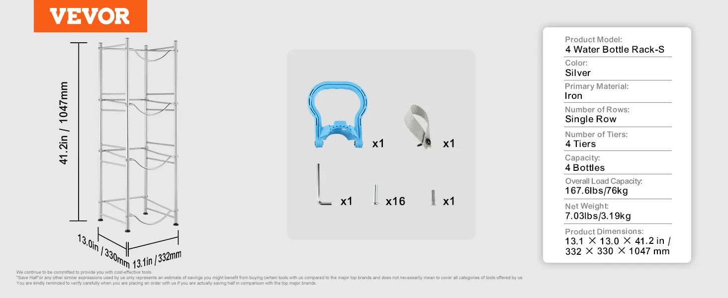 This 4-tier water jug holder measures 13 x 13 x 41.2 in, holds up to 4 bottles and supports up to 167.6 lbs. Its minimalist industrial design fits various interiors, making it an ideal choice for any space.