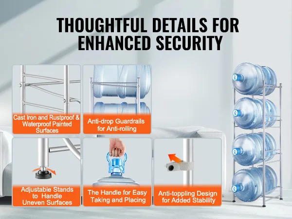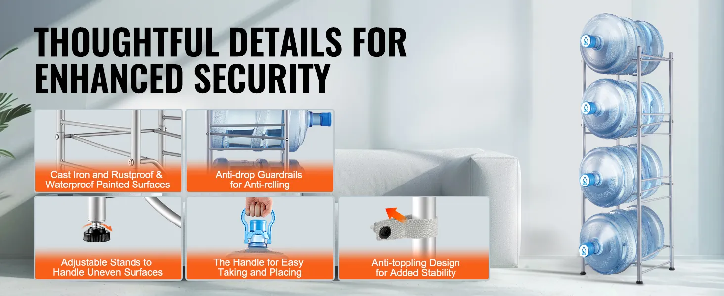 The water jug rack is made from durable cast iron with a rust-resistant finish. High guardrails and shelf grooves prevent bottles from sliding. Adjustable feet and an anti-tip feature keep the rack stable on uneven floors. Handles make lifting and placing bottles easy.