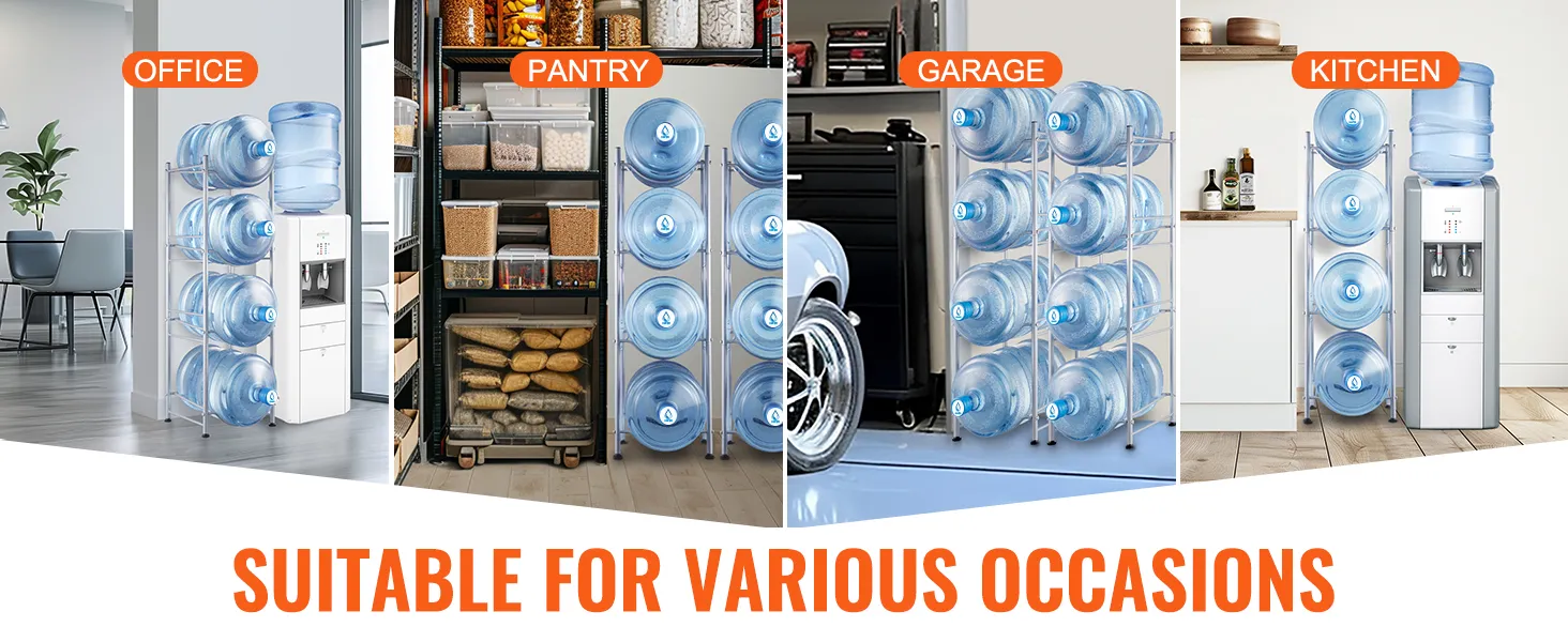 The water jug stand is perfect for living rooms, storage rooms, kitchens, garages, food pantries, closets, laundry rooms, gyms, and offices. It provides an efficient solution for storing multiple bottles.