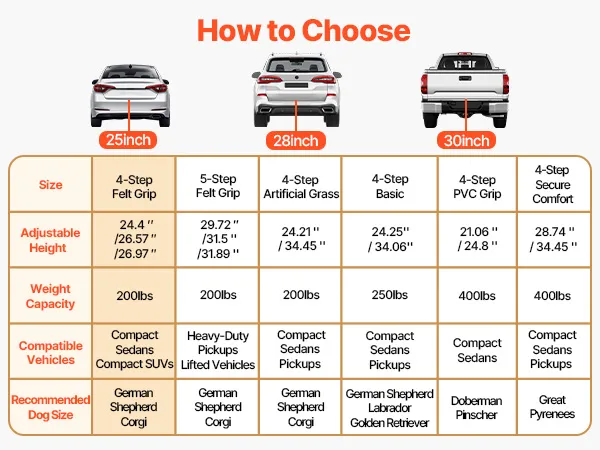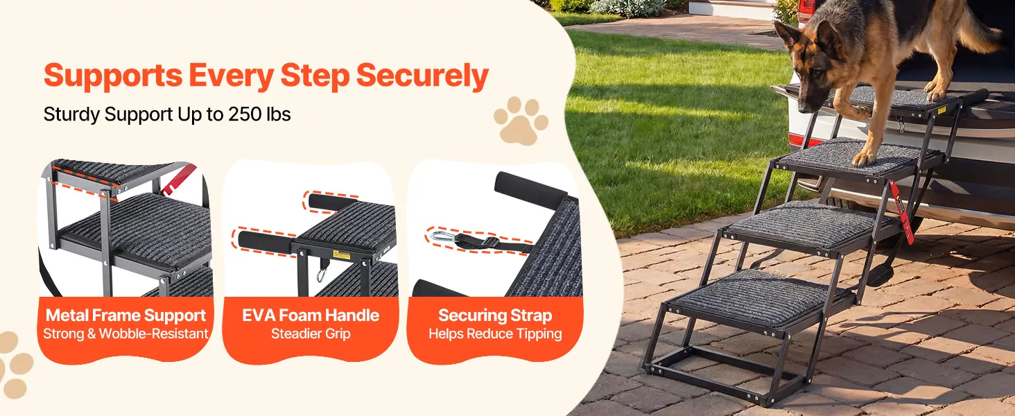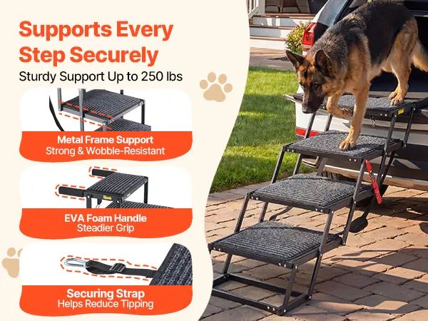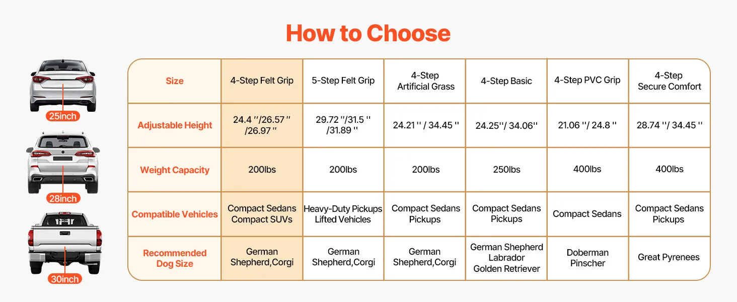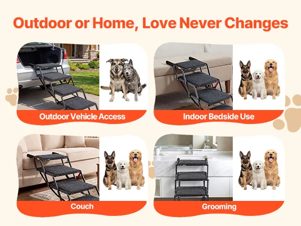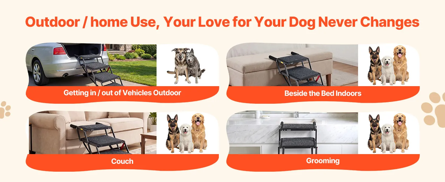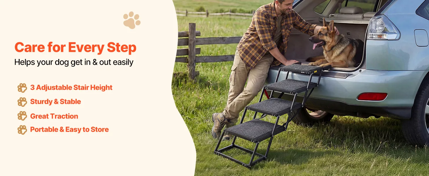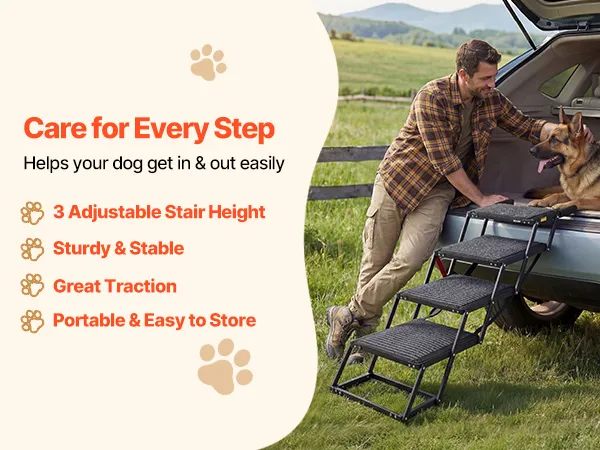 • Gemakkelijke toegang voor uw hond: Deze hondenoprijplaat heeft vier treden en drie verstelbare hoogte-instellingen. Hij is ideaal voor oudere honden of huisdieren met beperkte mobiliteit, waardoor ze veilig in en uit de kofferbak kunnen stappen.