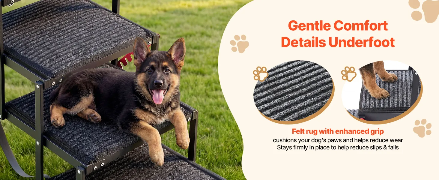• Comfortabele instap: Onze autotrap voor honden heeft brede treden bekleed met zacht vilt om de poten van uw hond te beschermen tegen verwondingen. Het oppervlak biedt een veilige grip en voorkomt uitglijden, zodat uw hond veilig in de auto kan stappen.
